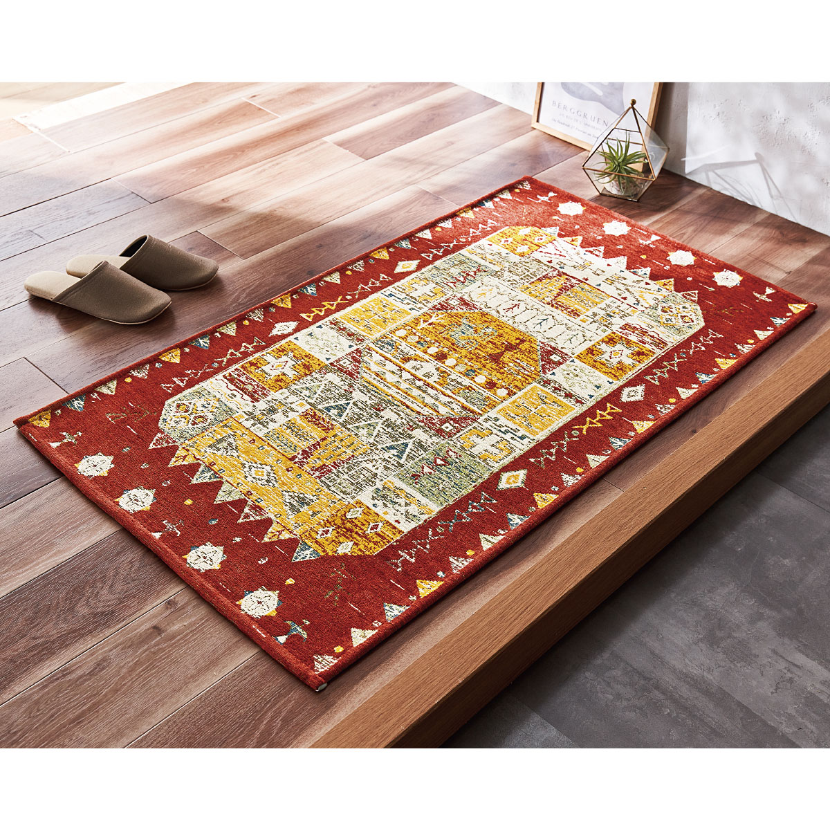 レッド(横120×縦70cm)多彩な色糸が織りなすアンティーク風ギャッベ柄が美しい玄関マットです。