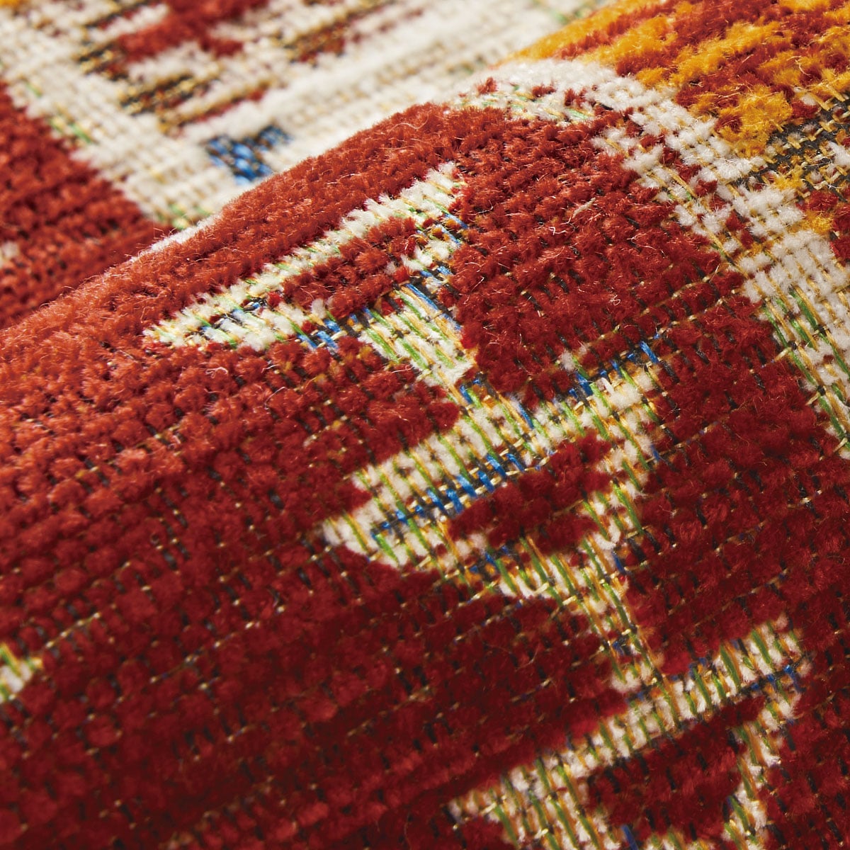 多彩な色糸が織りなすアンティーク風ギャッベ柄が美しい、ゴブラン織り風の玄関マットです。シェニール糸を使用したなめらかな肌ざわりも魅力です。
