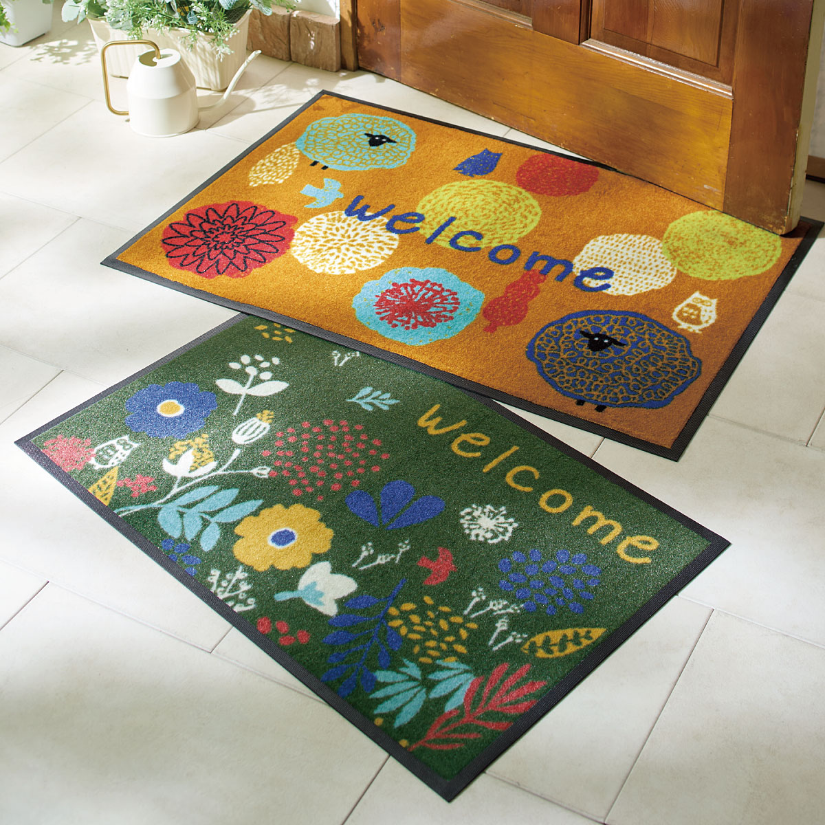 (上から)オレンジ系B(横90×縦59cm)、グリーン系A(横75×縦47cm)玄関先を明るく演出しながら泥やほこりをしっかりキャッチ。ドアの開閉を邪魔しない薄型です。