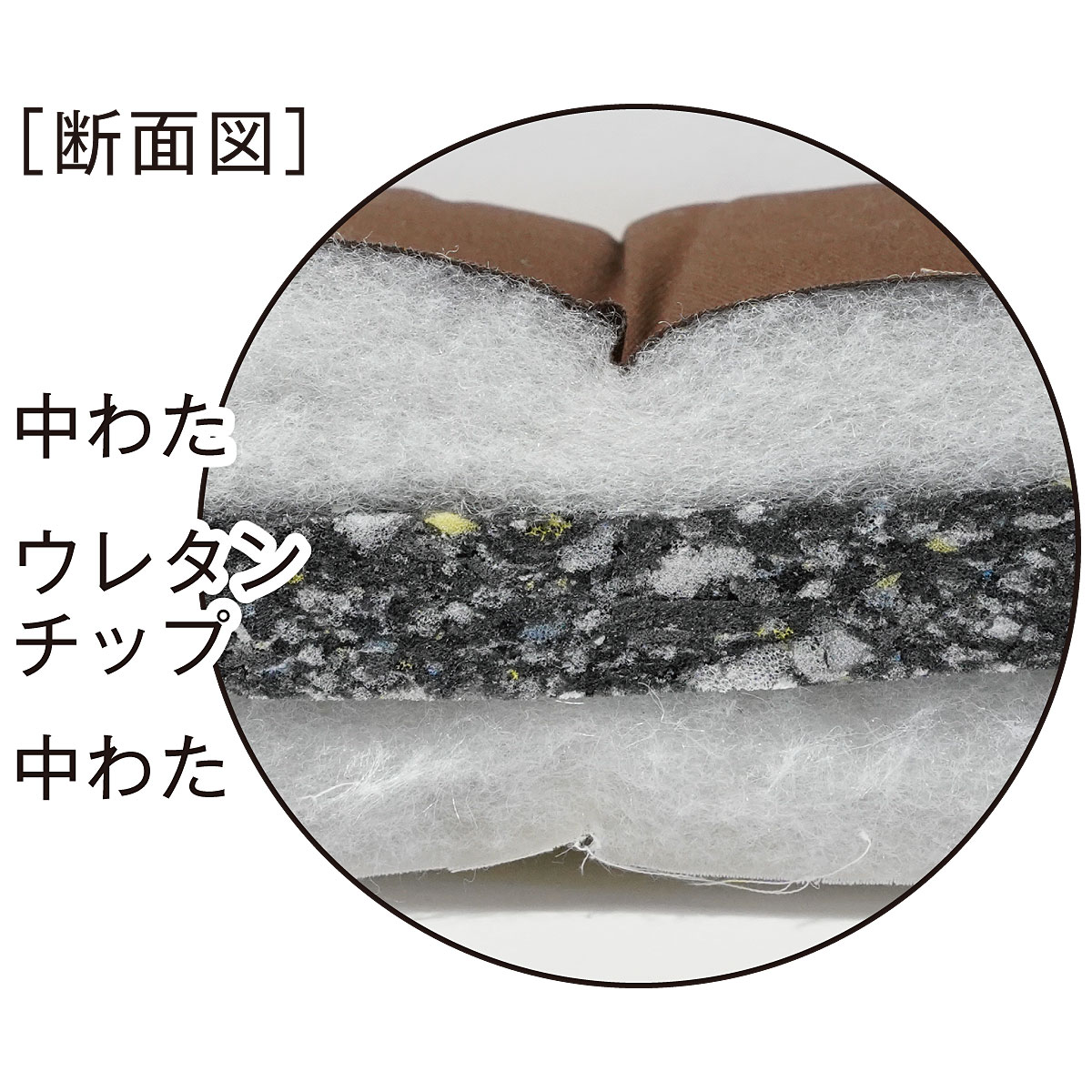 通常よりヘタリにくいウレタンチップを中材に採用! 厚さが50%になる圧力を8万回加えても2.3%しかへこみませんでした(一財カケンテストセンター調べ)。