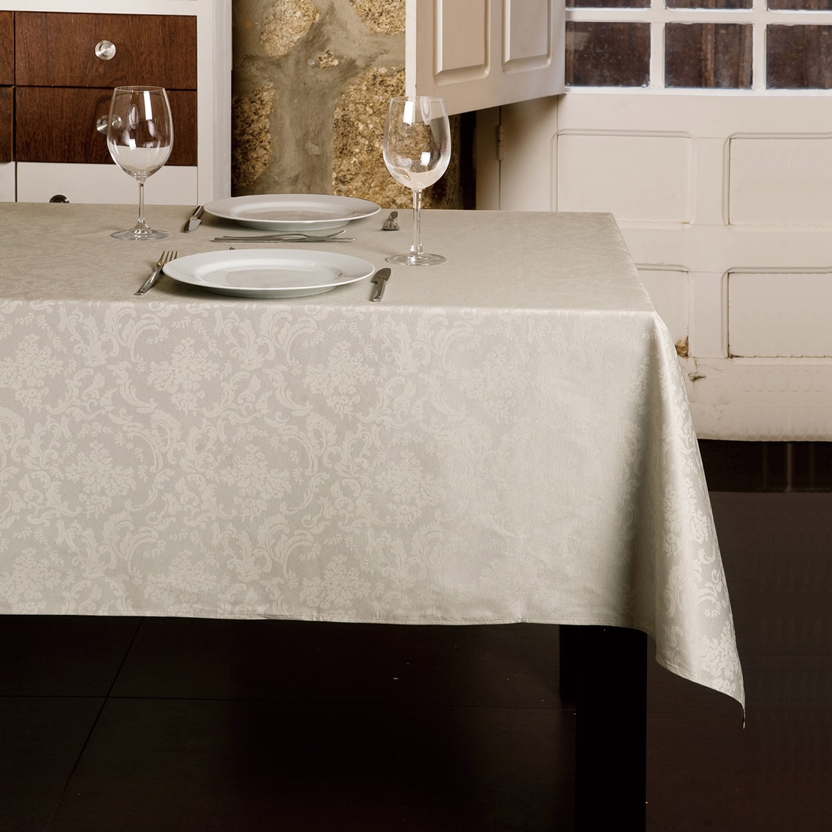 シンプルで高級感が漂う、スペイン製のテーブルクロスです。おしゃれなダマスク柄が食卓を彩り、いつものダイニングがゴージャスな雰囲気に。