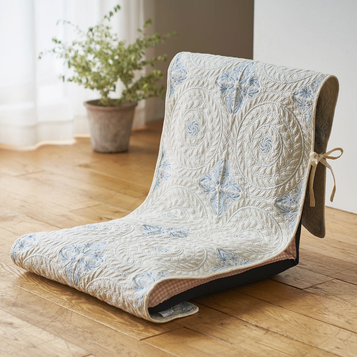 エレガントな刺しゅうでリビングをランクアップ。気持ちのいい綿100%の生地にゴージャスな刺しゅうをあしらったチェアカバーです。紐を結ぶだけなので、装着簡単!座椅子カバーとしてもお使いいただけます。