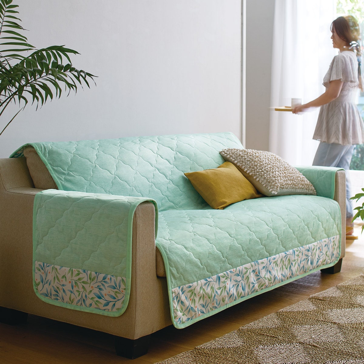 グリーン L (3人掛け用)ソファでのくつろぎが涼やかに。ひんやりキルト中掛けソファカバーです。