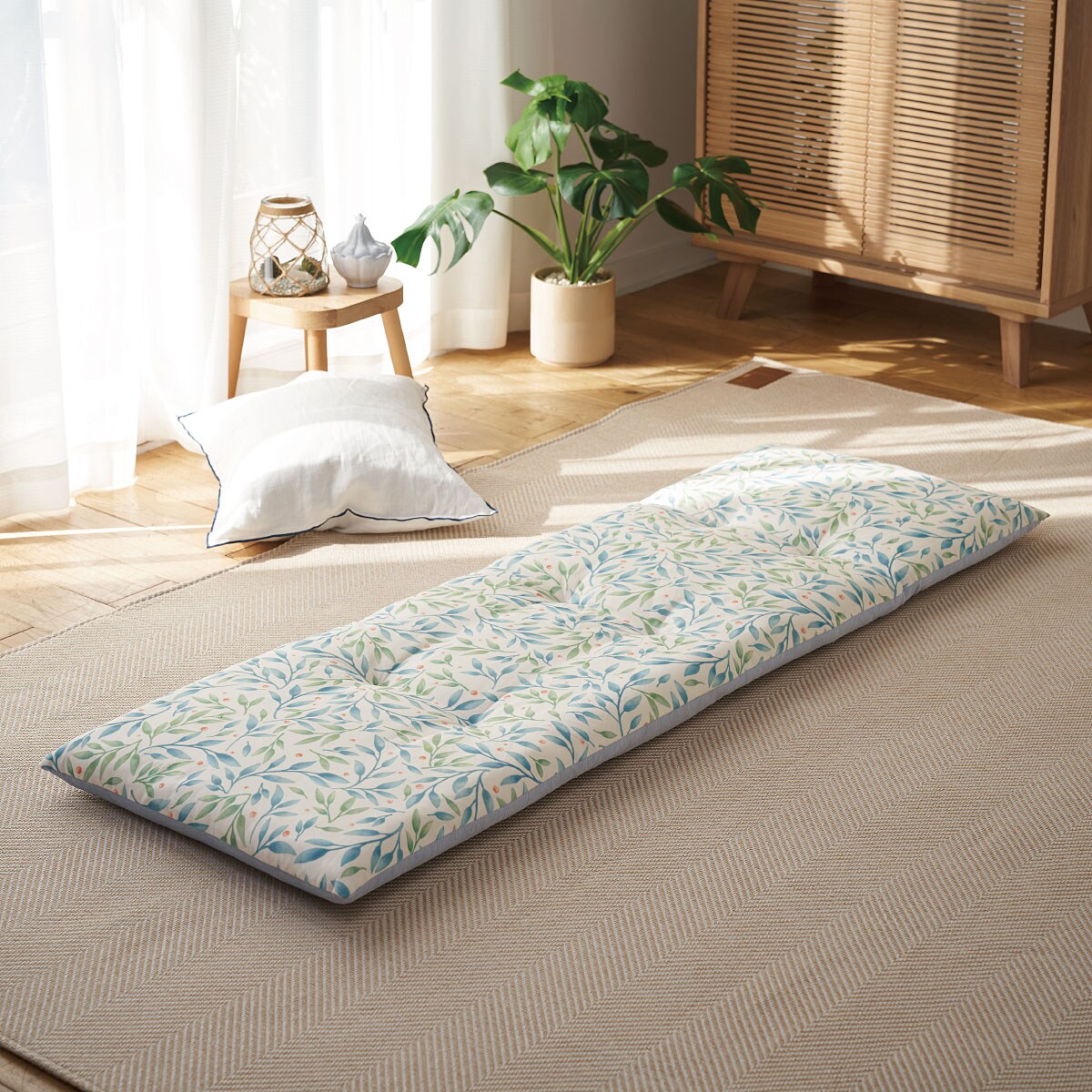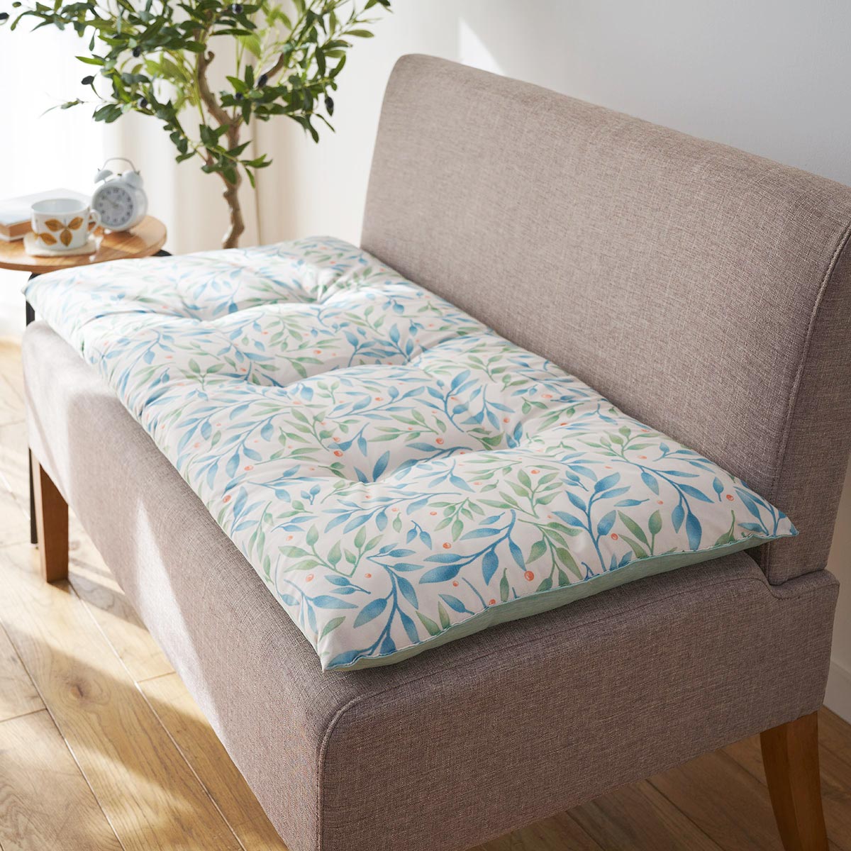 寝具で大好評のスマートドライにソファパッドが新登場!敷くだけでひんやり感とボリューム感がアップします。厚み約6cmのふっくらとした座り心地でごろ寝クッションとしてもお使いいただけます。3シーズン使えるリバーシブル仕様です。裏面は草花柄でパッと明るい印象にしてくれます♪