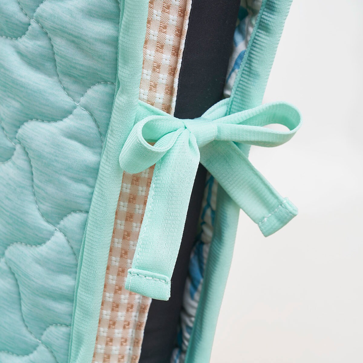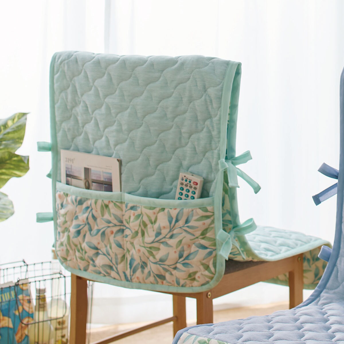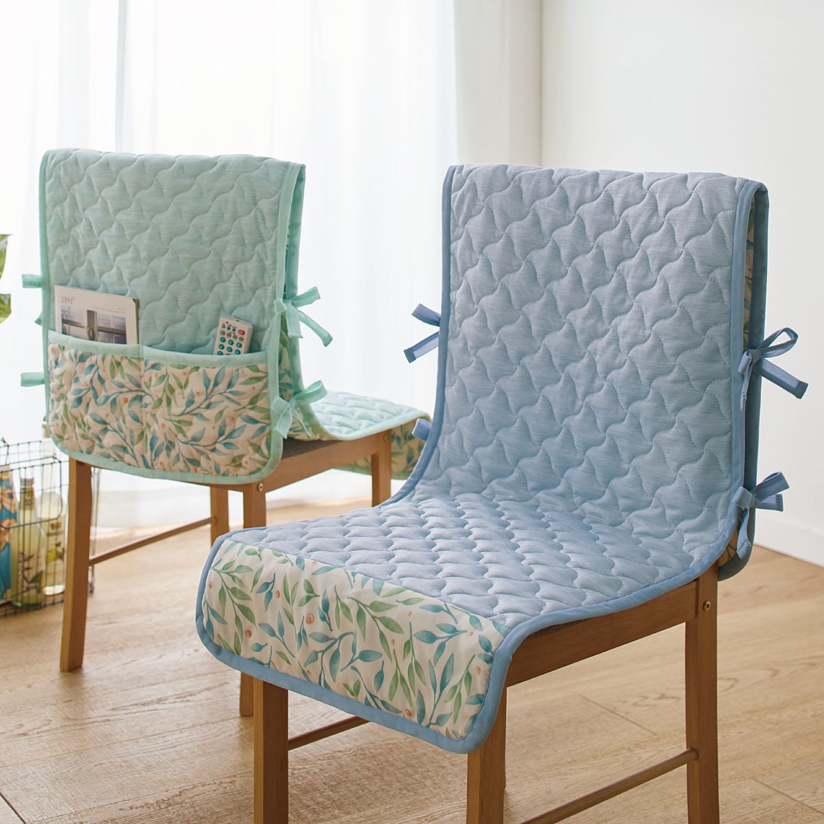 • (左から)グリーン・ブルー<br>腰かけるたびに心地よい清涼感。ひんやりキルトチェアカバーです。