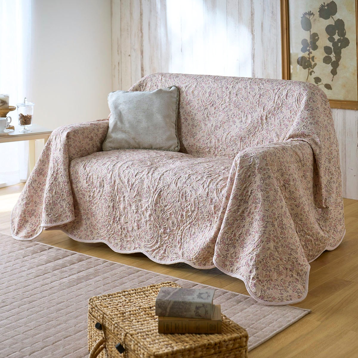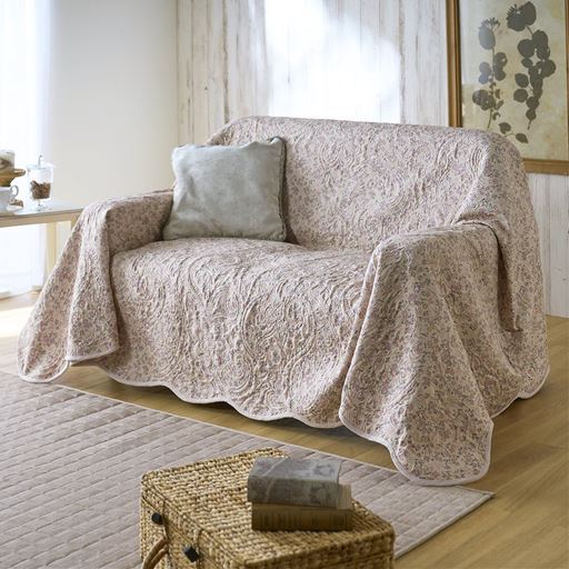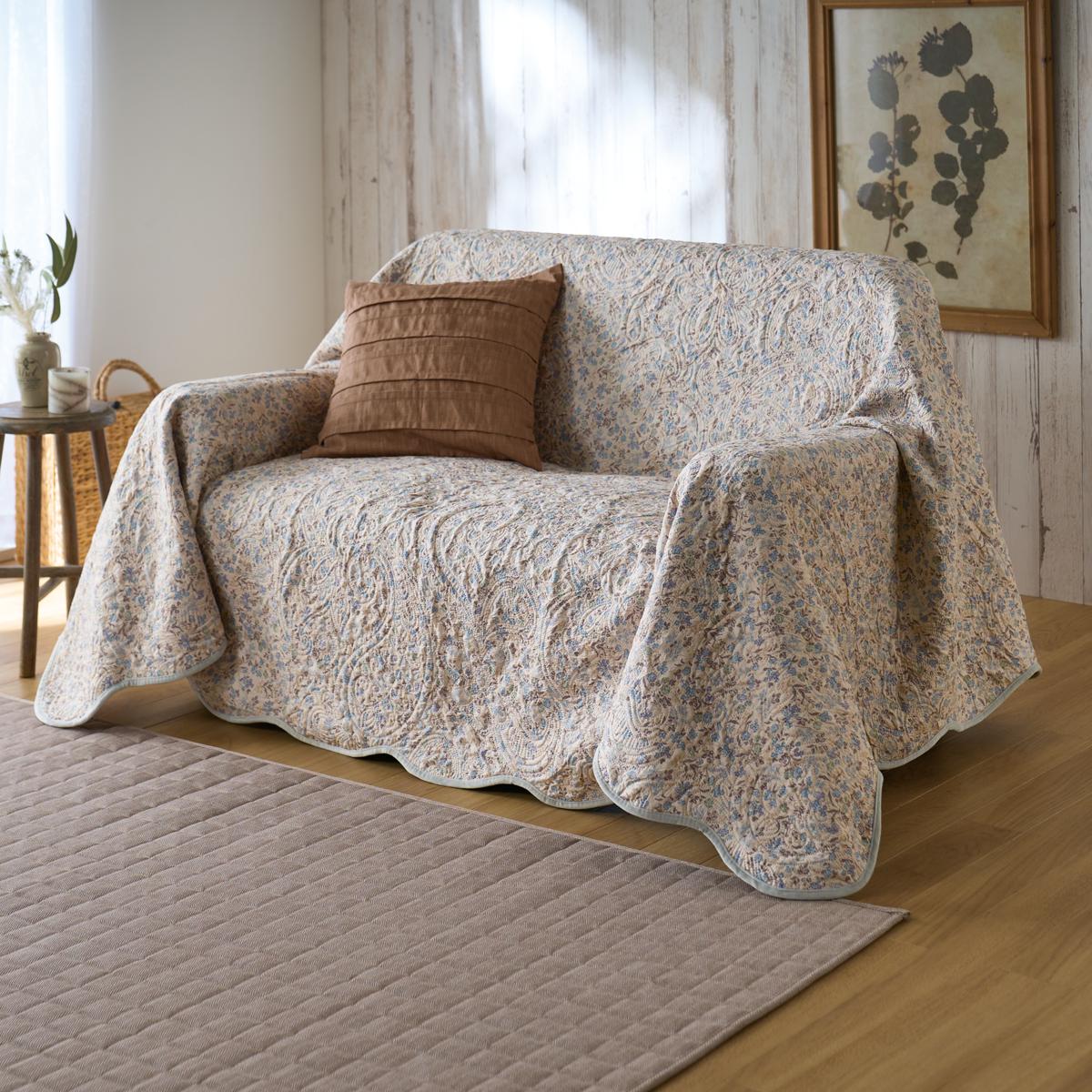なめらかに起毛した上品キルト面と、さらりとした小花柄のリバーシブル仕様。ソファカバーとしてはもちろん、ベッドカバーやラグなどにもお使いいただけます。