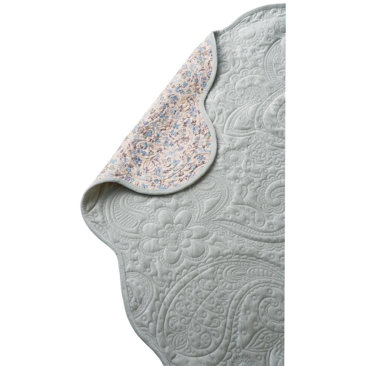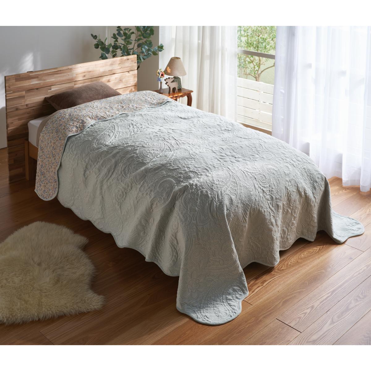 上品キルトと小花柄のリバーシブル仕様。なめらかに起毛したキルト面と、さらりとした小花柄。糸を使用しないキルト加工を施しているので、ペットがいるご家庭にもおすすめです。ソファカバーとしてはもちろん、ベッドカバーやラグなどにもお使いいただけます。