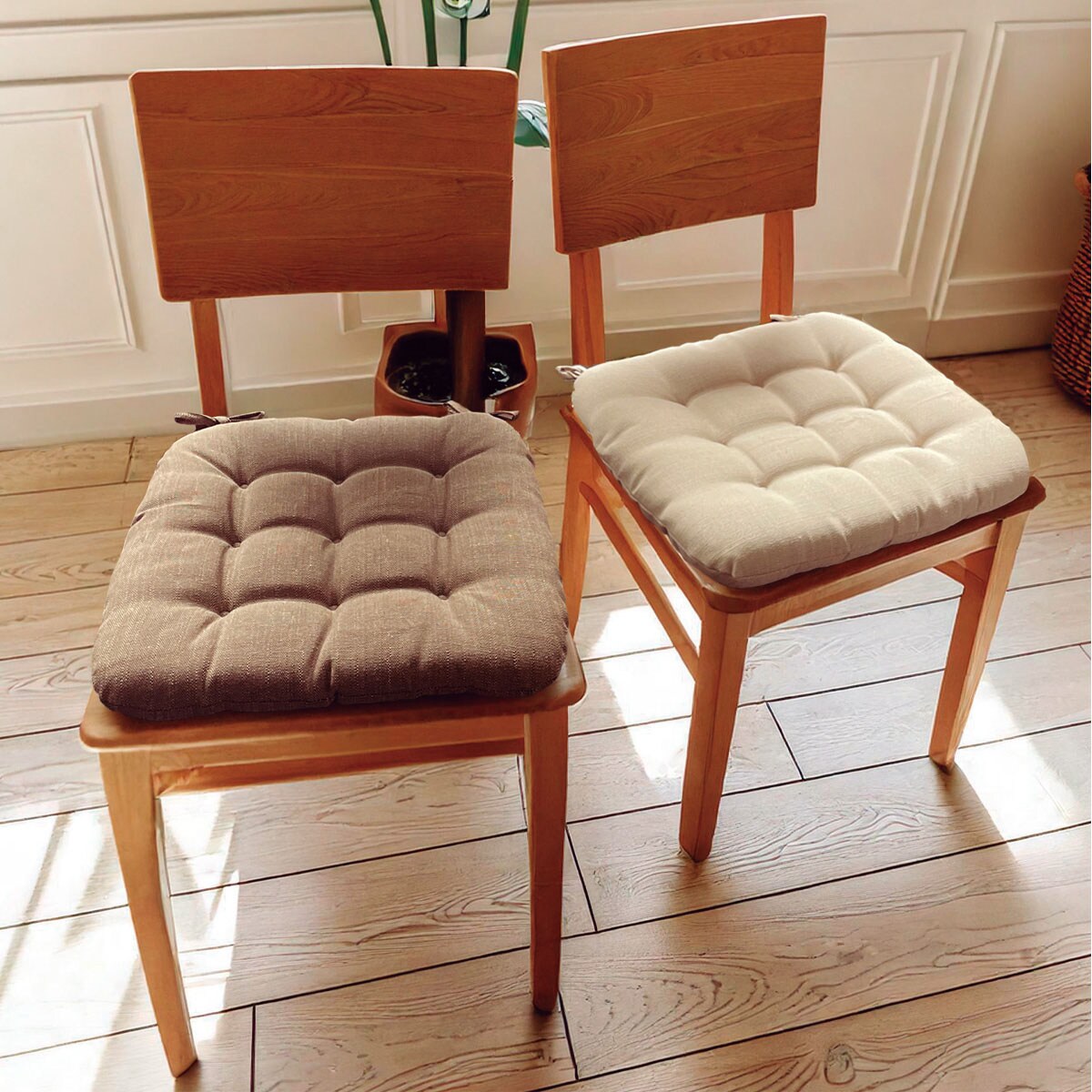 ダイニングのオシャレなアクセントになる、スペイン製生地を使ったチェアパッドです。見た目はもちろん、ふんわりした座り心地が魅力的。紐つきで椅子に固定でき、ズレ落ちがないのもうれしいポイントです。