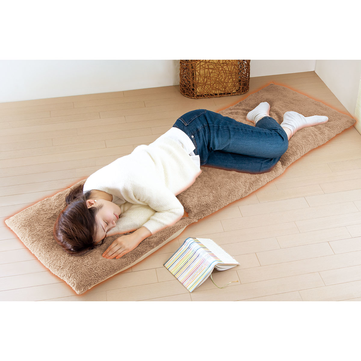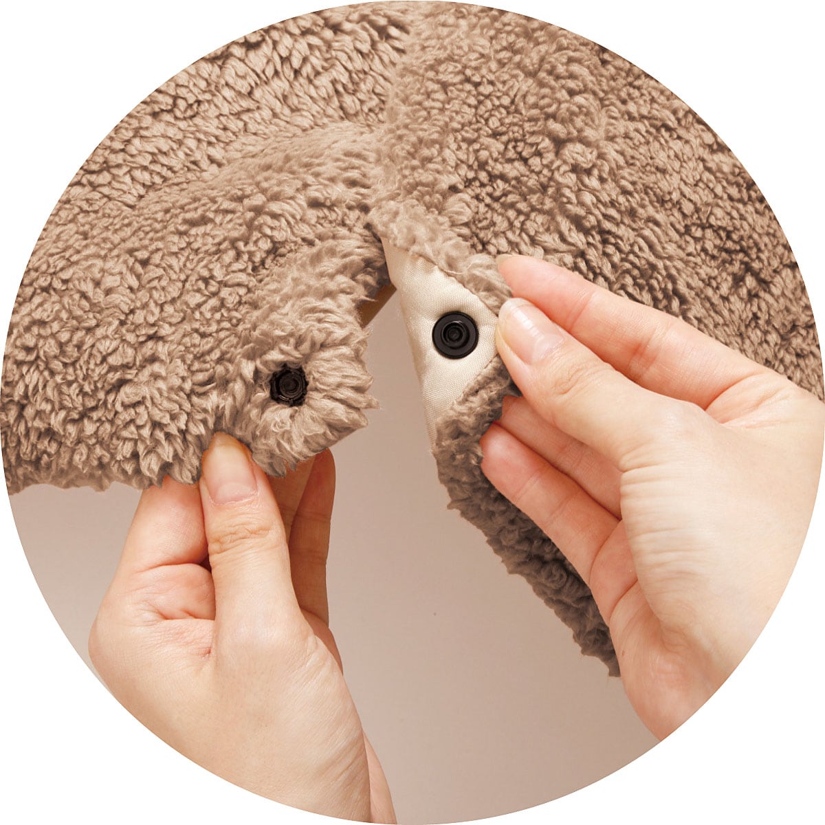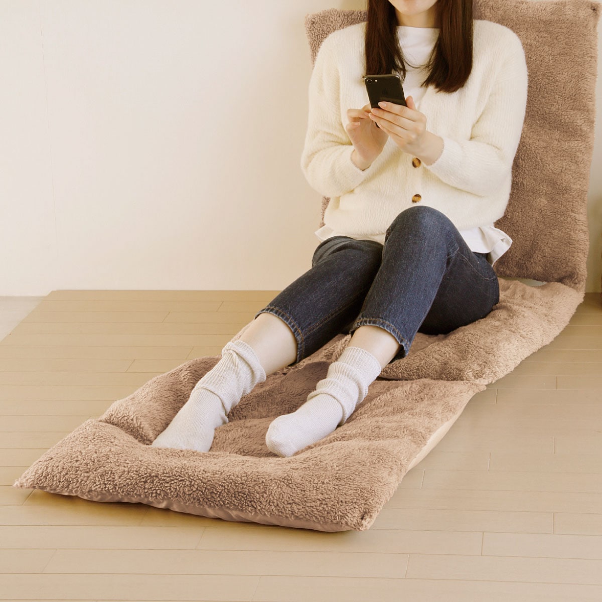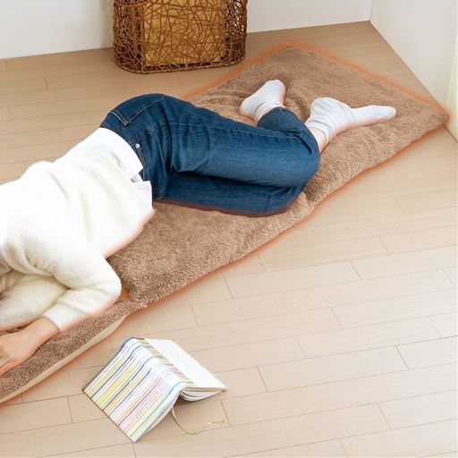 ふわふわのやわらかい中わたとあったかな極暖生地。思わず寝転びたくなる心地よさです。
