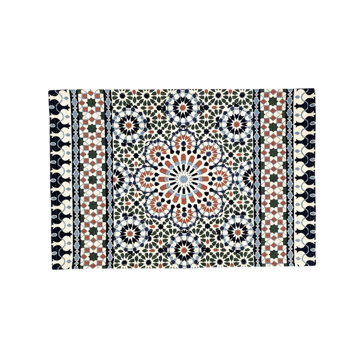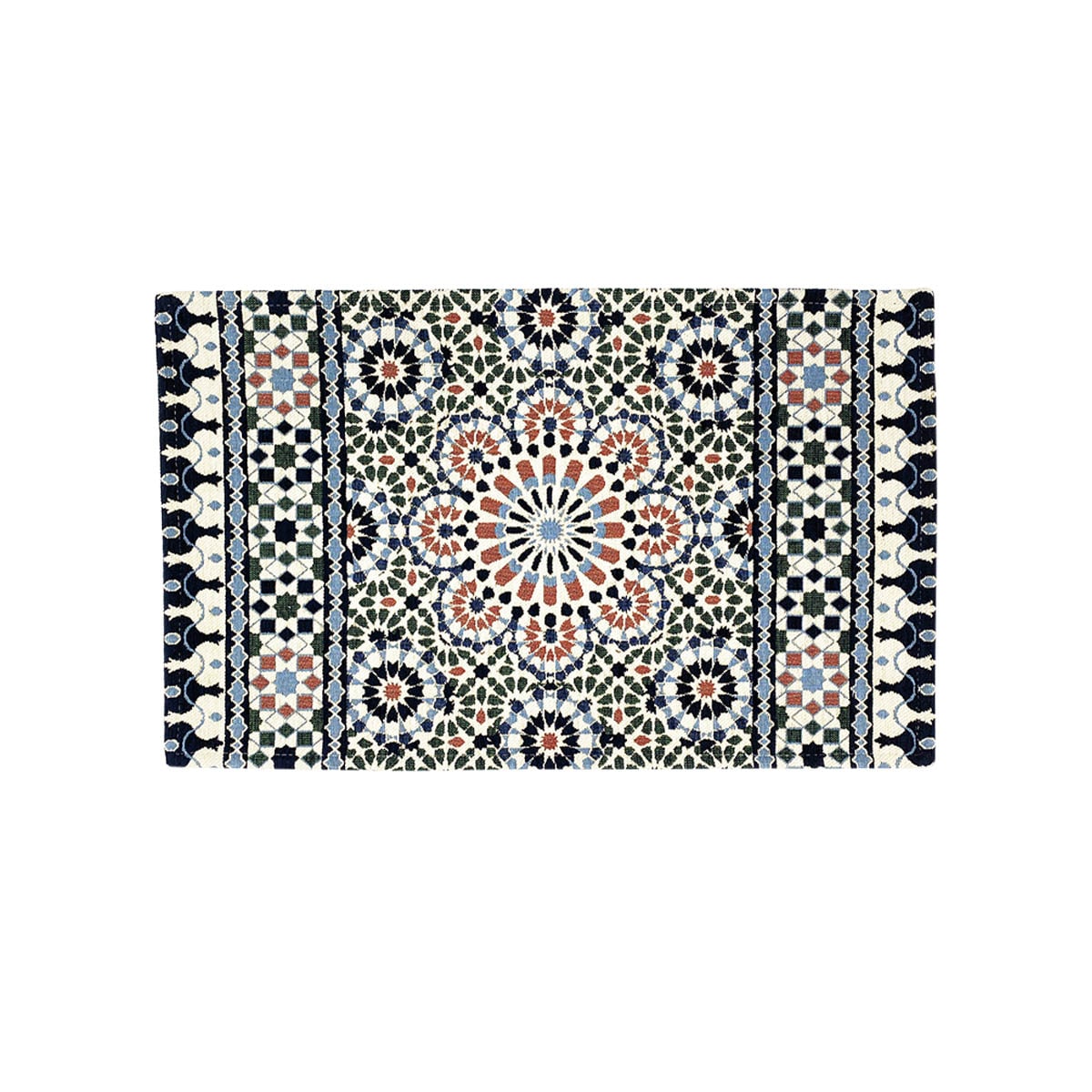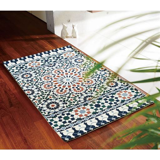 エキゾチックなタイル模様が目を惹く玄関マット。毛足が短いのでほこりやゴミがたまりにくく、お手入れ簡単です。裏面はすべりにくい加工付き。
