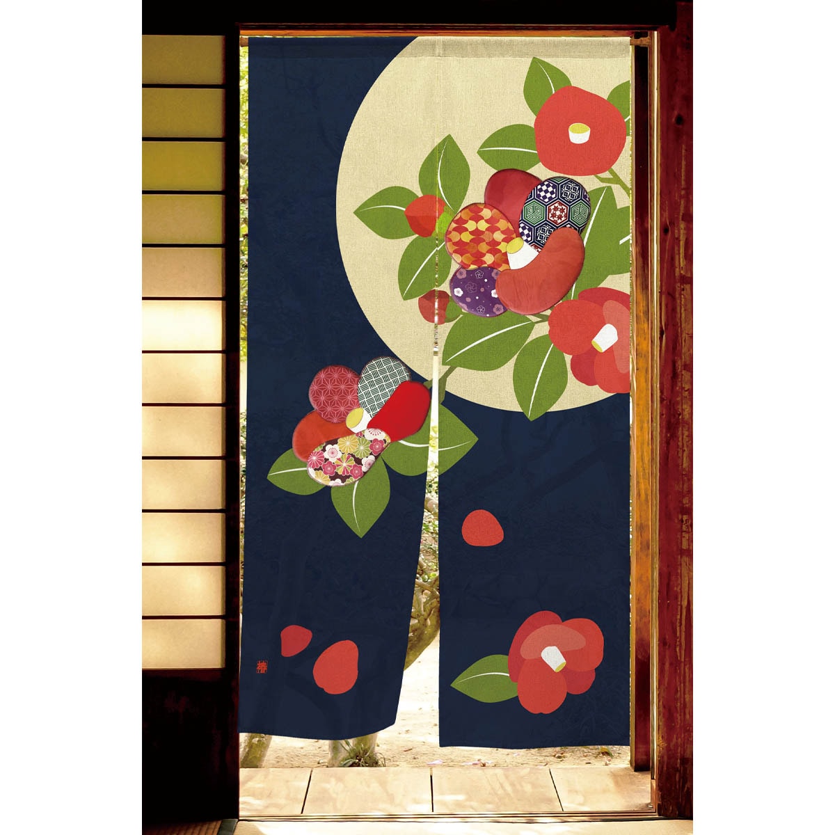 満月の月を背景に椿が描かれた上品な和風のれん。椿の一部分がアップリケなので奥行き感も楽しめます。(Aつばき)