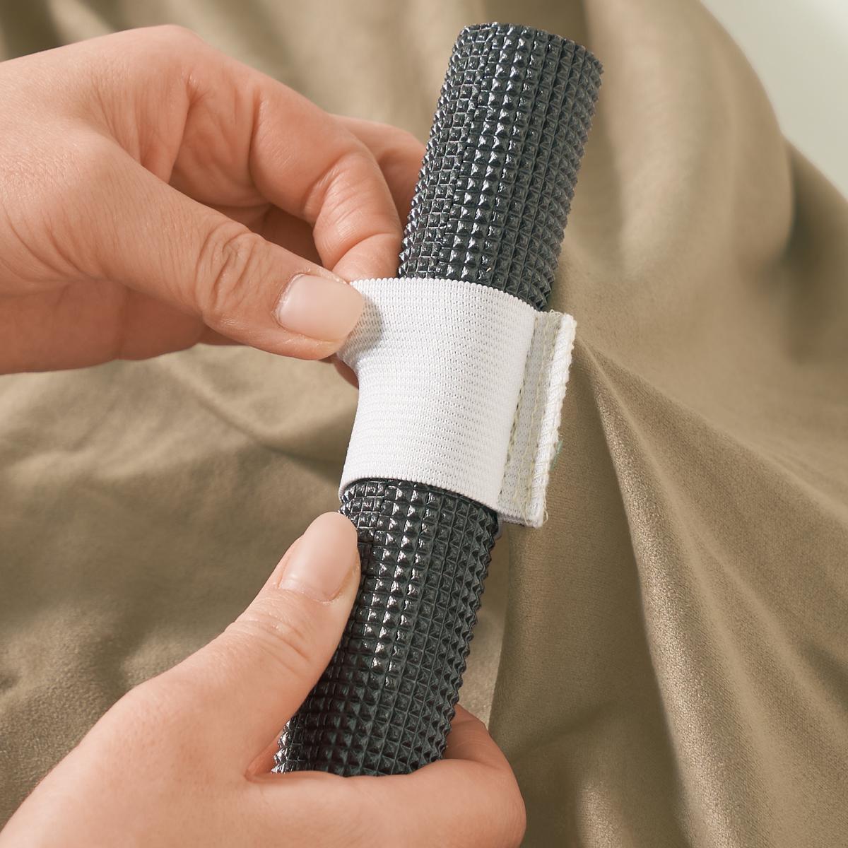 固定パイプを生地裏のゴムバンドに通してソファの隙間に押し込みます。