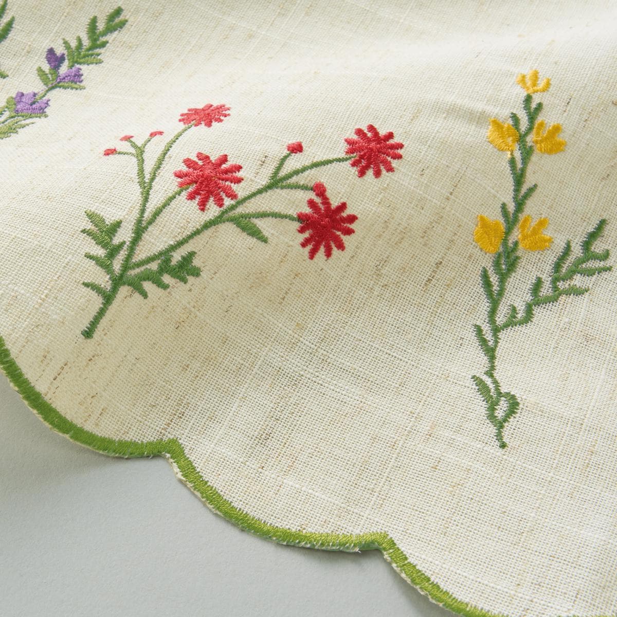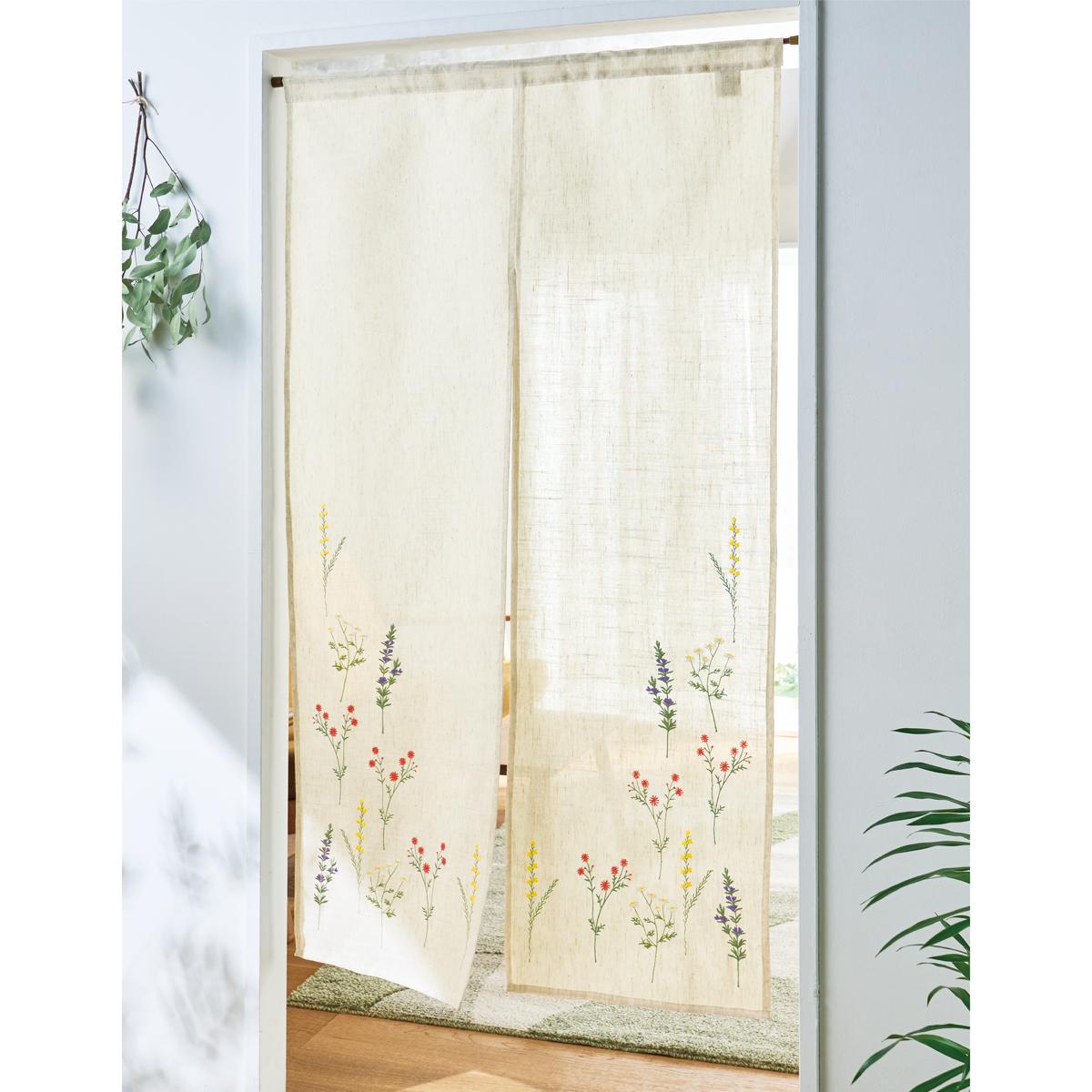 涼やかに、目隠し&日差しカット! 刺しゅう入り麻混のれん&カフェカーテンです。裾のスカラップ刺繍がアクセントに。