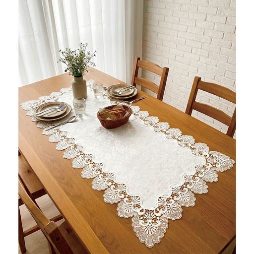 優美なレースでテーブルが素敵に変身!上品なジャカード織り生地部分ははっ水仕様だからこぼしてもサッと拭けてお手入れ簡単。