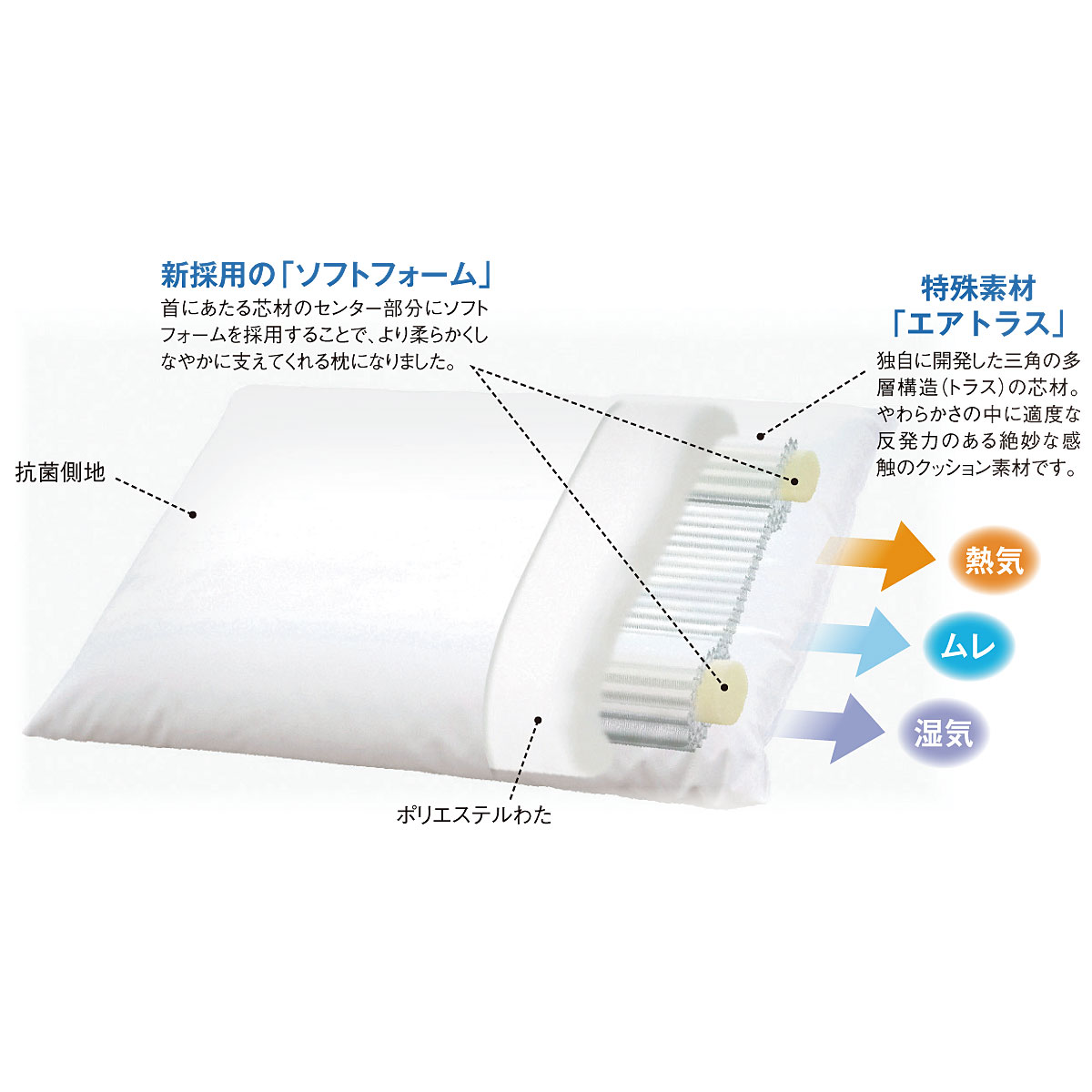 首に当たる芯材のセンター部分に「ソフトフォーム」を採用することで、より柔らかくしなかやかに支えてくれる枕「NEWボディチューニングピロー エアトラス」です。独自に開発した三角の多層構造(トラス)の芯材は、柔らかさの中に適度な反発力があり絶妙な感触。中央が凹み、両サイドに高さがある構造なので隙間を作らず頭と首を支え、横向き寝でも仰向き寝でも快適な寝姿勢をサポートします。選べる2種類の高さで、その日の体調やお好みで枕の高さを調整できるのもうれしいポイントです。