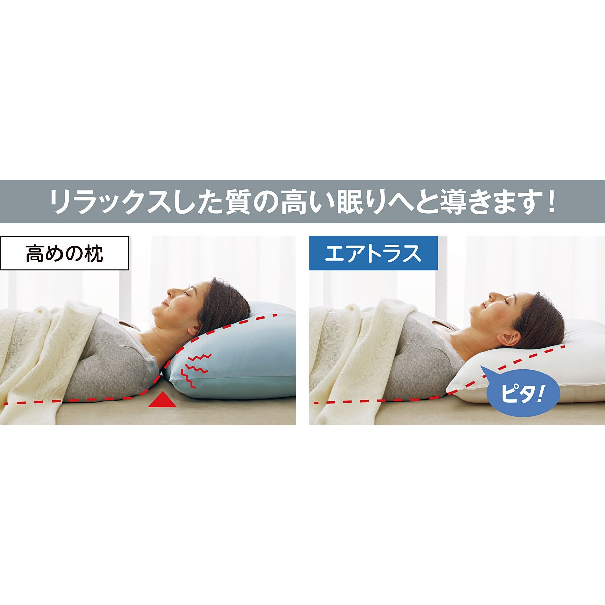 高めの枕は首と枕の間に空間ができ、肩や首、下半身の筋肉まで緊張状態に。エアトラスは頭と首が心地よくフィットし、自然な寝姿勢をキープします。