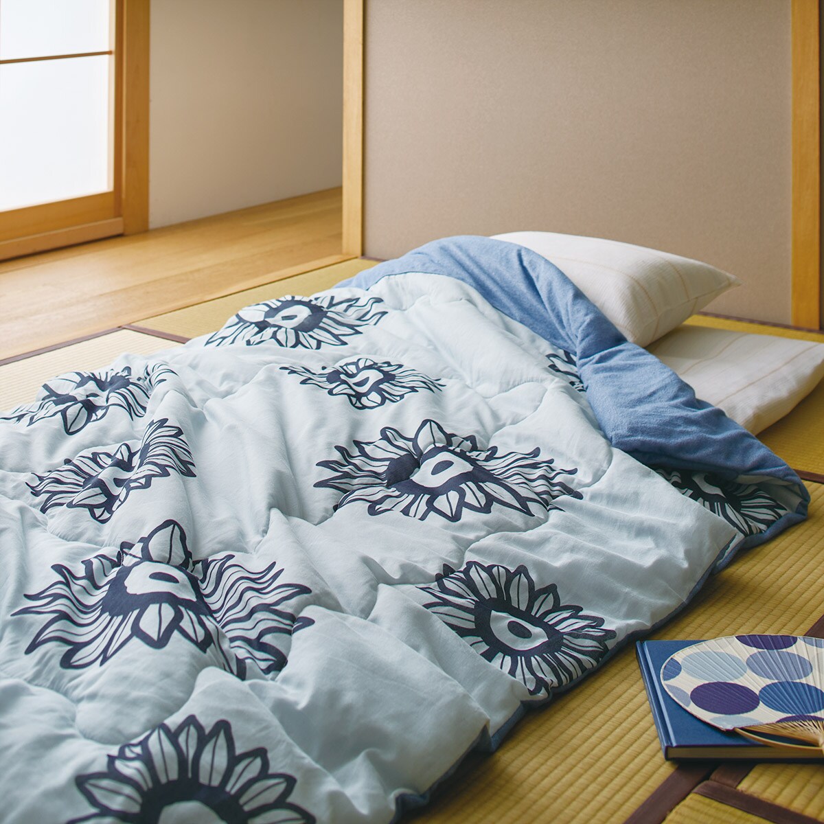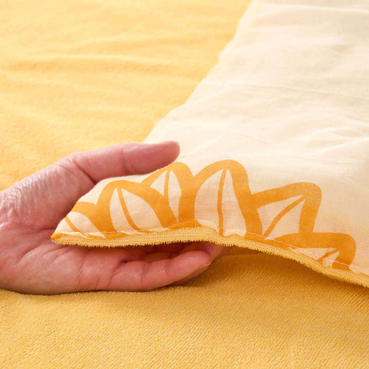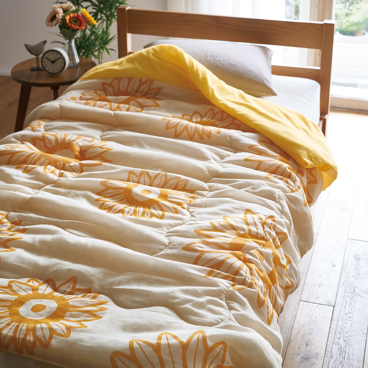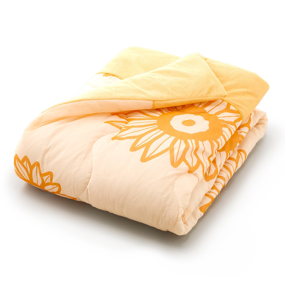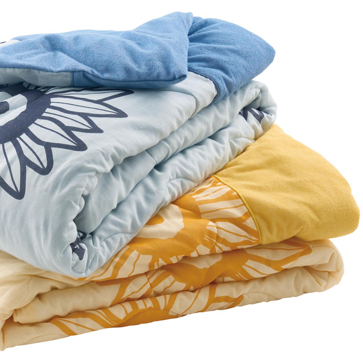 表面はガーゼ生地、裏面はタオル生地を使用した、ふっくら軽い肌掛け布団です。綿100%素材で心地よい肌ざわり。ひまわり柄の爽やかなデザインがおしゃれなポイントです。
