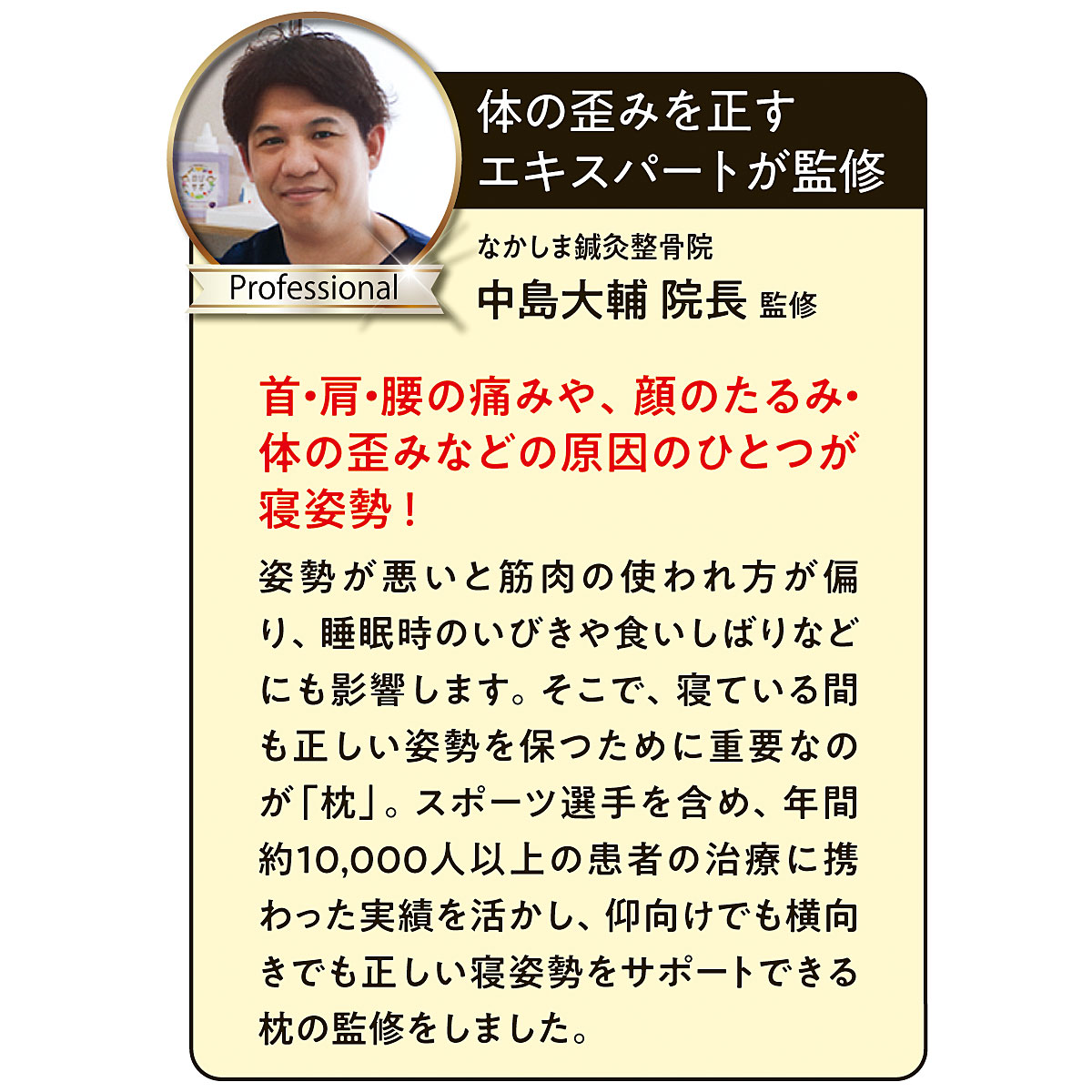 年間約10000人以上の患者の治療に携わり、体の歪みを正すエキスパートが監修したまくらです。頭と首が心地よくフィットして自然な寝姿勢を保てます。