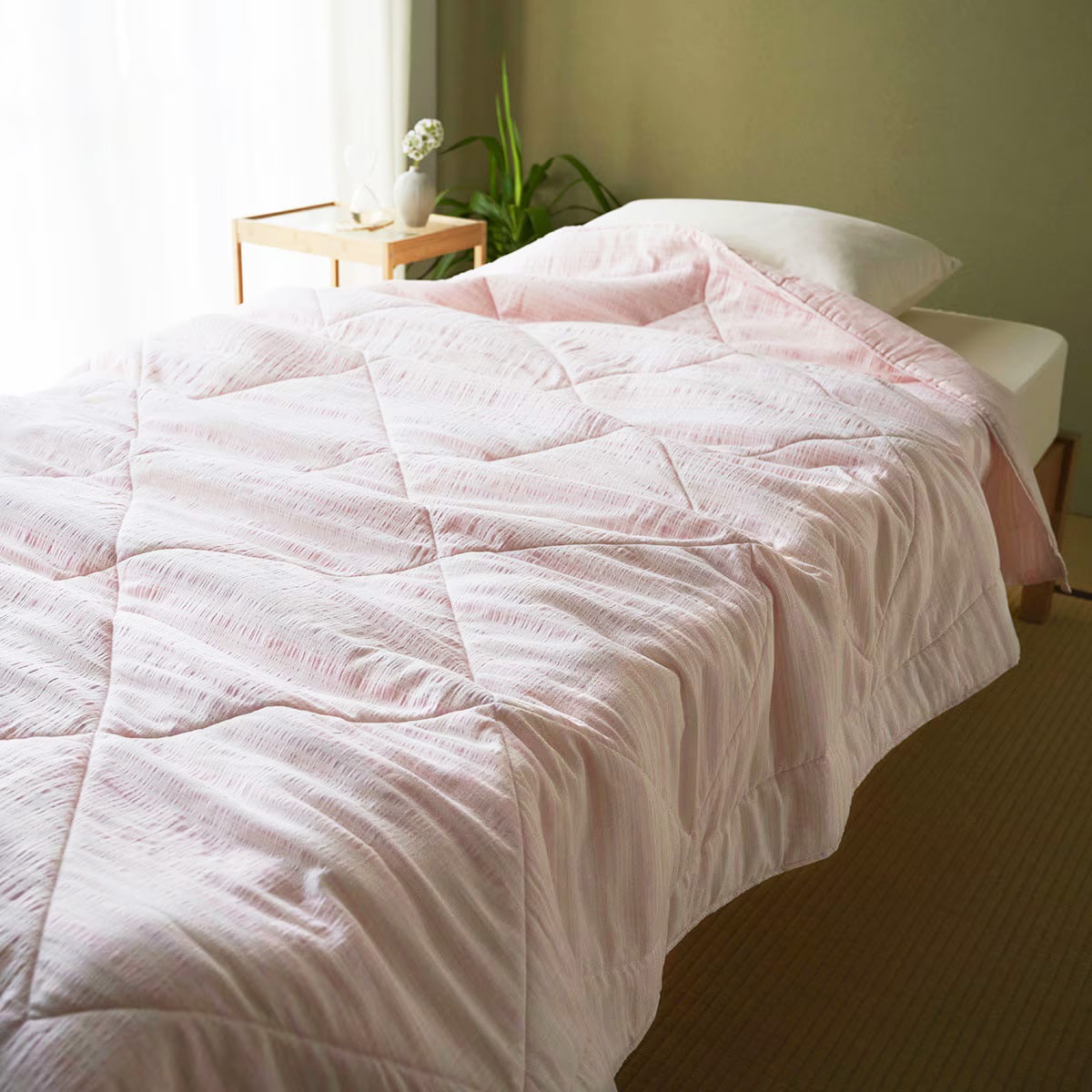 高島産ちぢみを使用した肌掛け布団です。ちぢみとは思えないほどのやわらかなシャリ感がべたつきや肌ざわりが気になる夏にぴったり。表面にシボがあるため、サラッとした肌ざわり。寝汗も吸い取ってくれるので、寝冷え対策にもおすすめです。