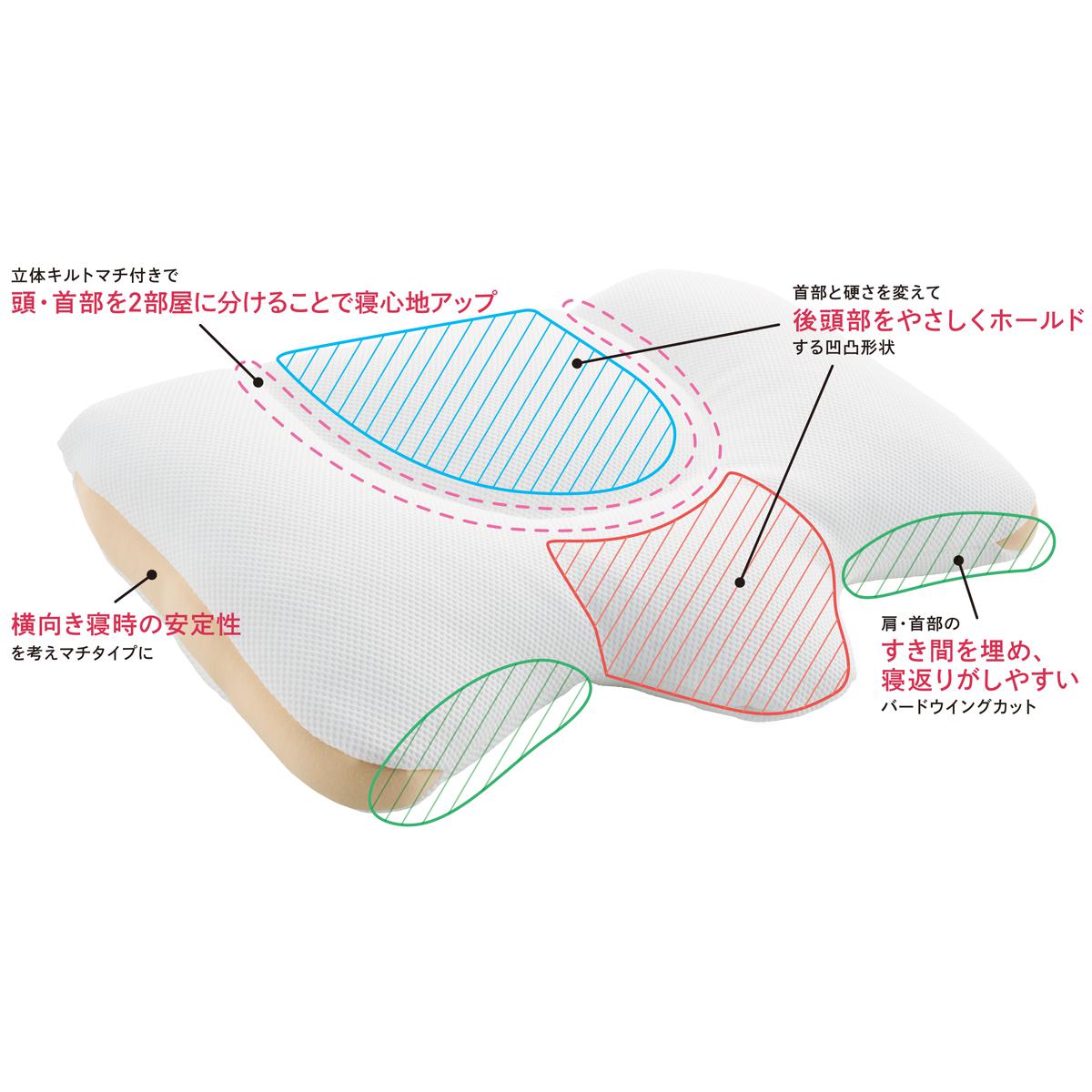 首部と硬さを変えて後頭部をやさしくホールドする凹凸形状頭、首部を2部屋に分ける立体キルトマチ付きで寝心地アップ肩・首部のすき間を埋め、寝返りやすいバードウイングカットポイントはネックバンプ形状。首の長い人も根元からしっかり支え、頭圧分散することで首が休まる形状。横向き寝時の安定性を考えたマチタイプ