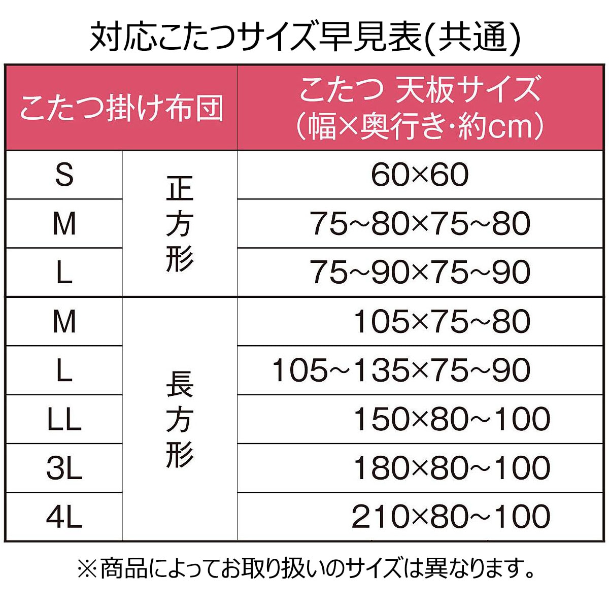 対応こたつサイズ一覧※販売していないサイズも掲載しています。
