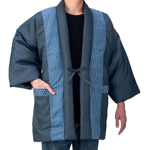 手軽にポカポカ! 吸湿発熱素材の中わたを使用した、あったかはんてんです。見た目もほっこり落ち着いた印象。上品な和柄がアクセントに。