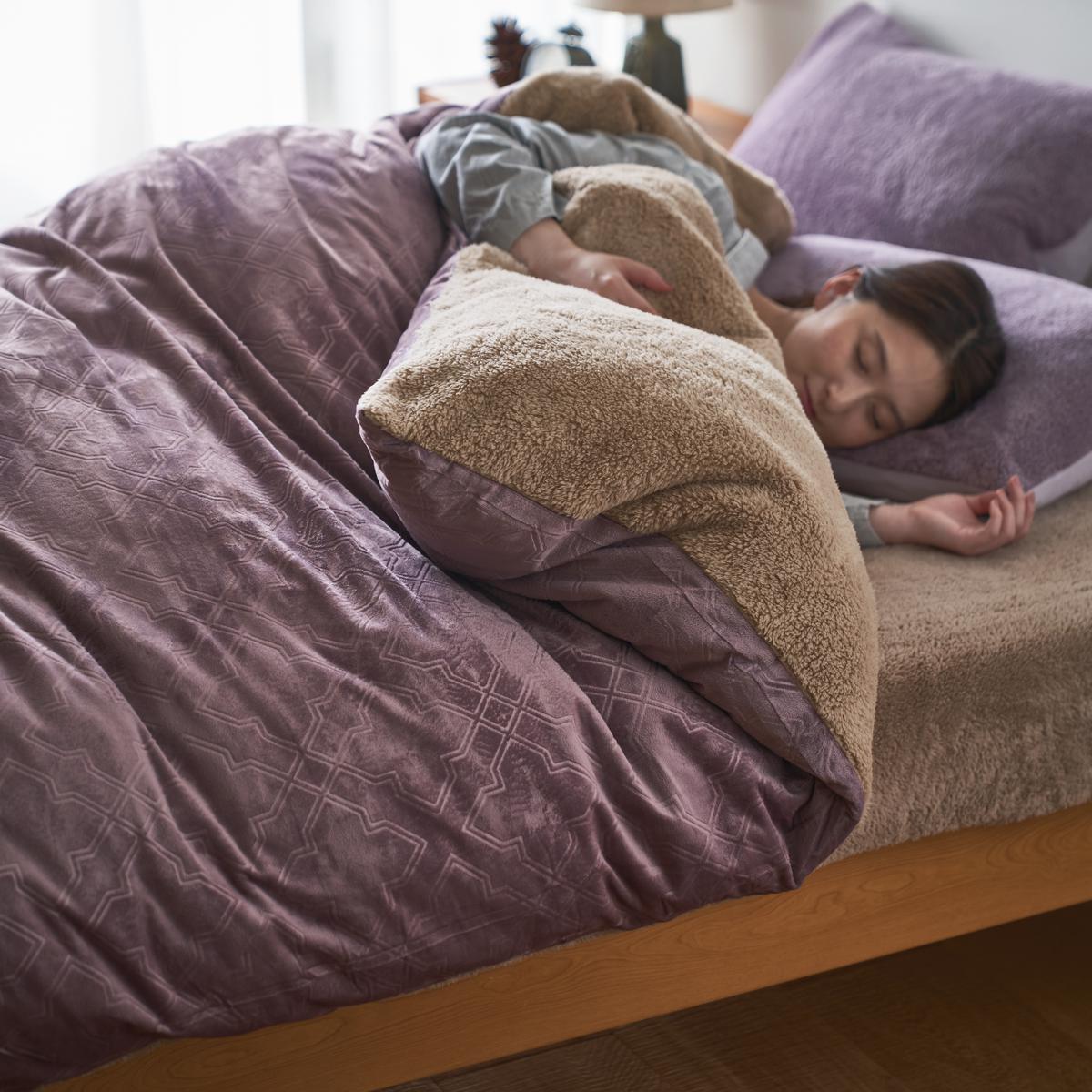 ミスティラベンダー(モロッカン柄)やわらかなマイクロファイバーが空気をたくさん抱え込み、ぬくもりをしっかり捉えて逃がしません。