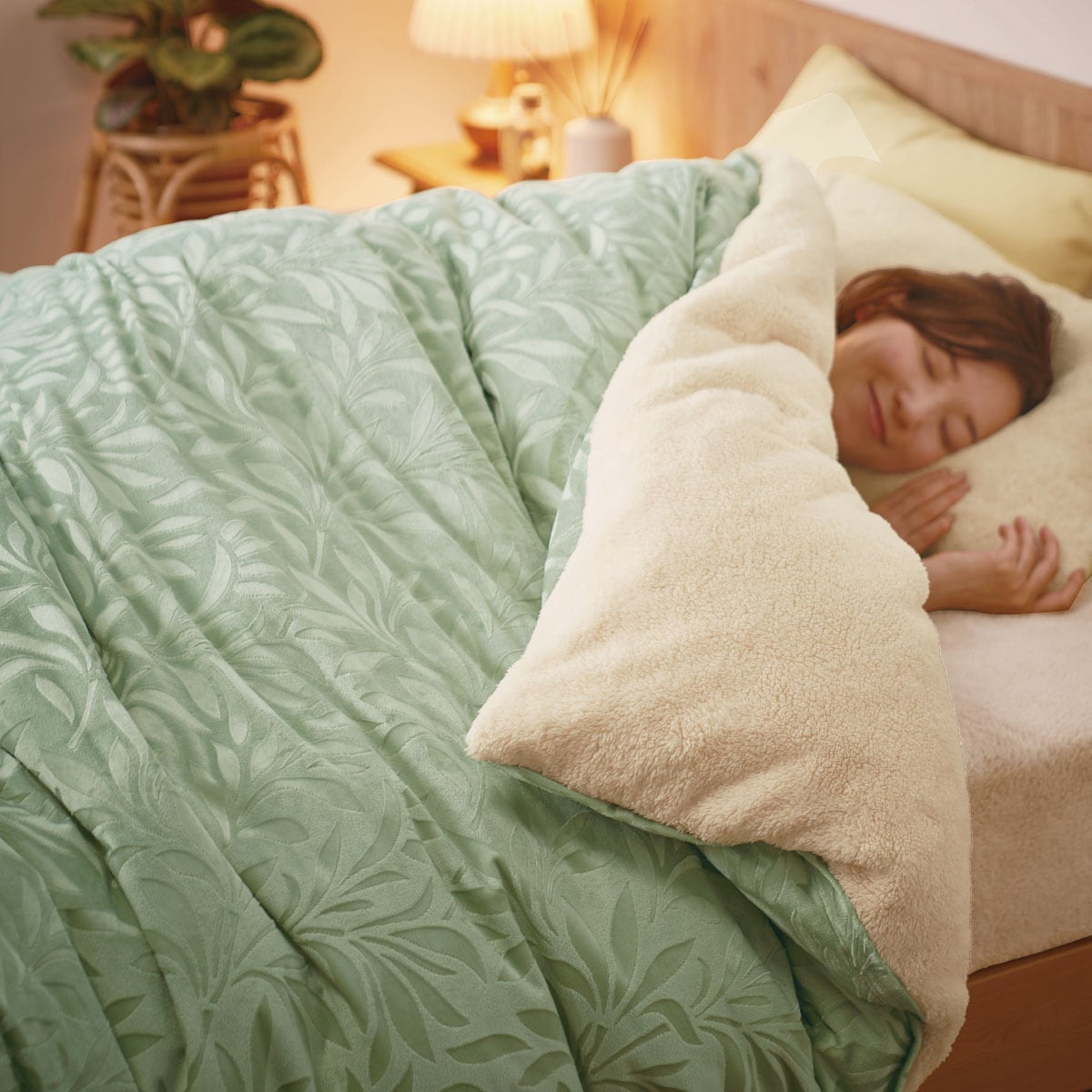 グリーン(リーフ柄) ※商品は布団を包む毛布です。朝まで布団がズレないからあったかい!