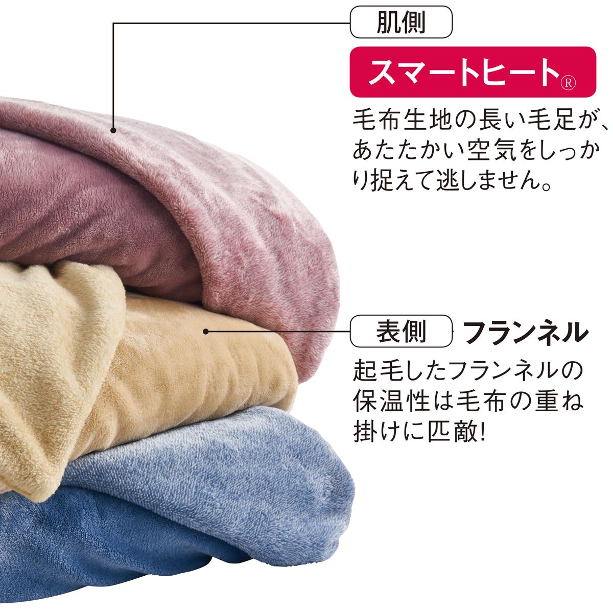 発熱する毛布生地でとろけるような暖かさ。吸湿発熱素材「スマートヒート®」を使用した、布団を包む毛布です。みっしりと詰まった毛足がぬくもりを逃がさずキープ。フランネル生地のなめらかな肌ざわりも魅力です。