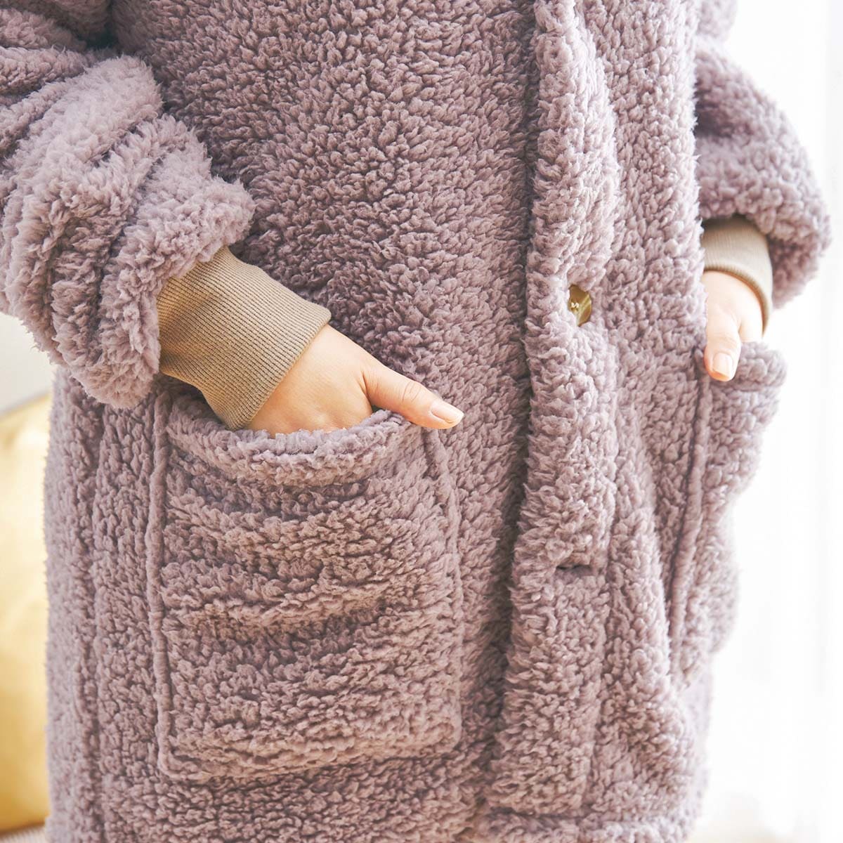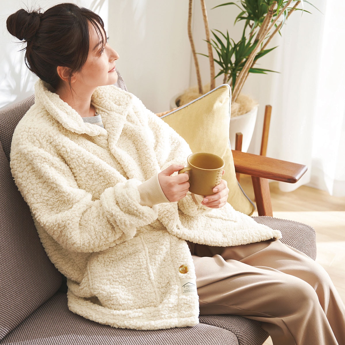ぬくぬく、心地いいくつろぎ時間。ふわっふわの着る毛布です。吸湿発熱素材とシープボアで保温性もバッチリ。おうち時間がもっと好きになるアイテムです。