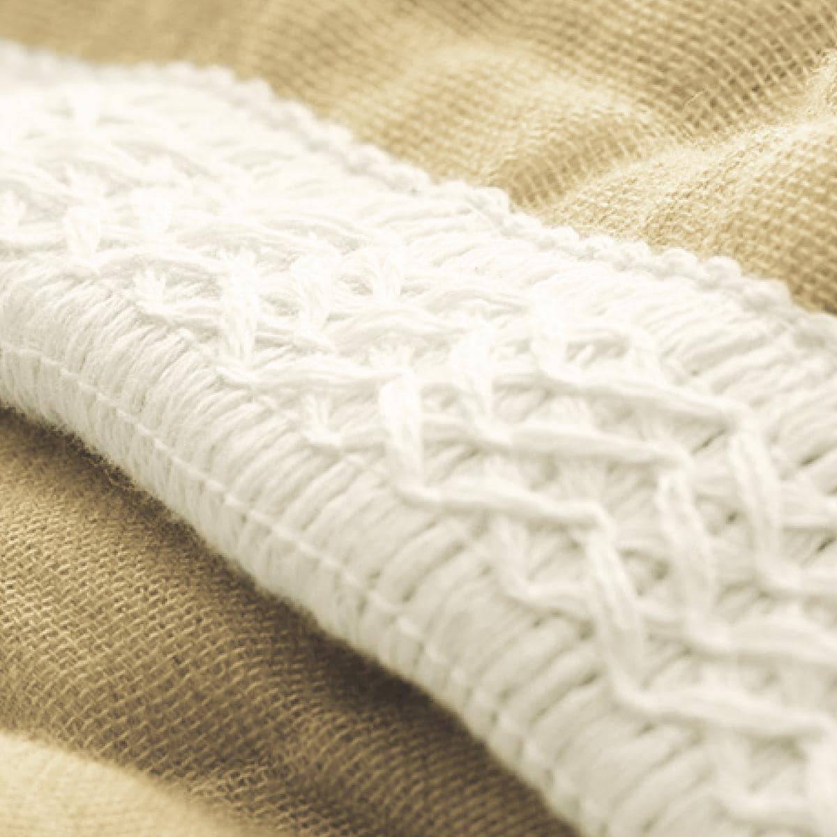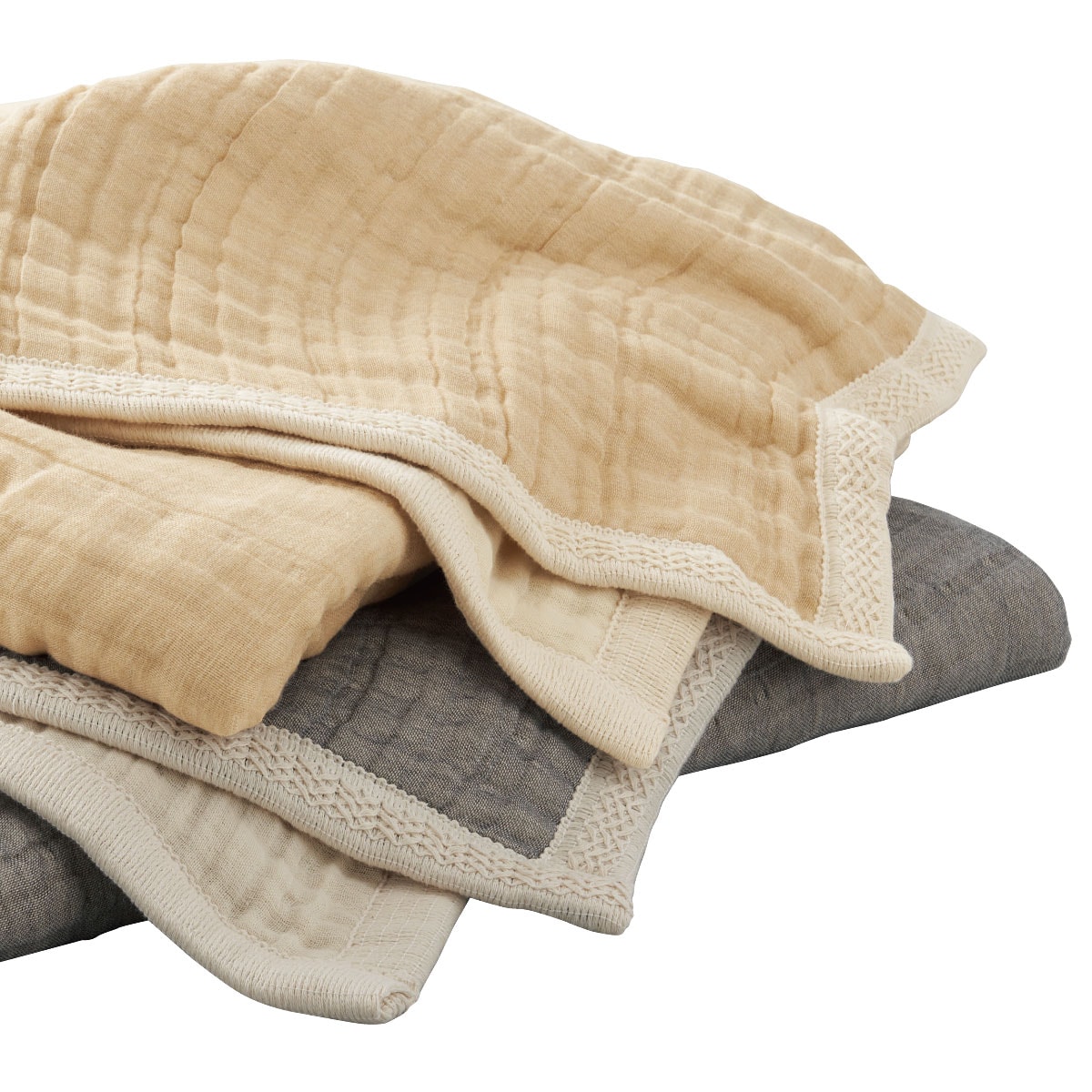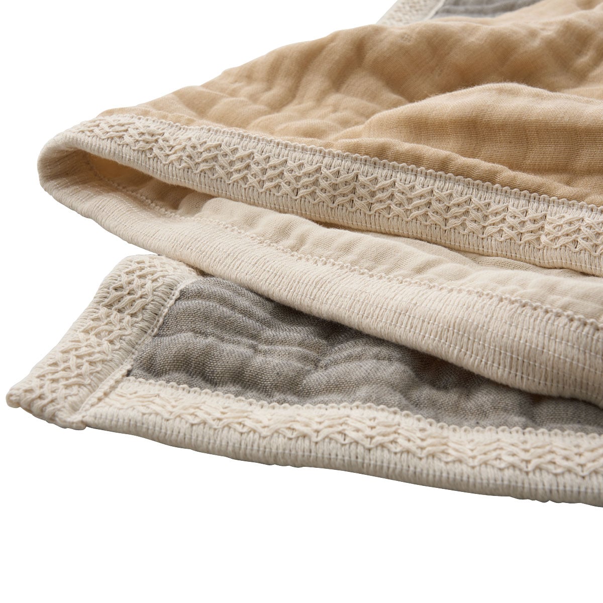 縁は手の込んだ編み地で丁寧に縫製し、肌あたりもやわらか。