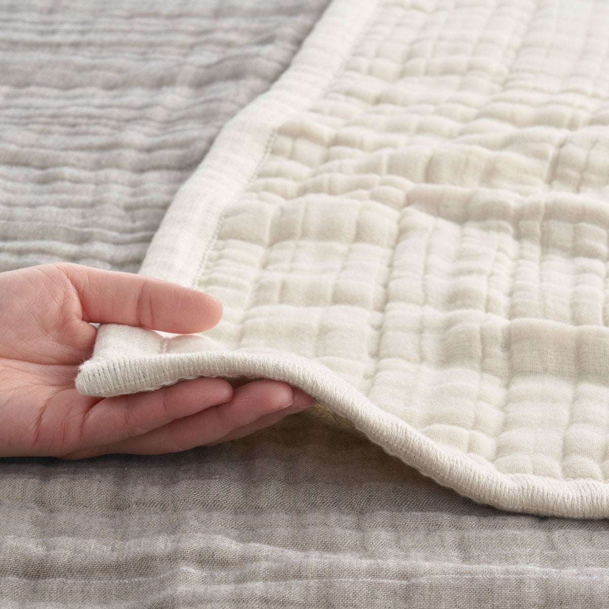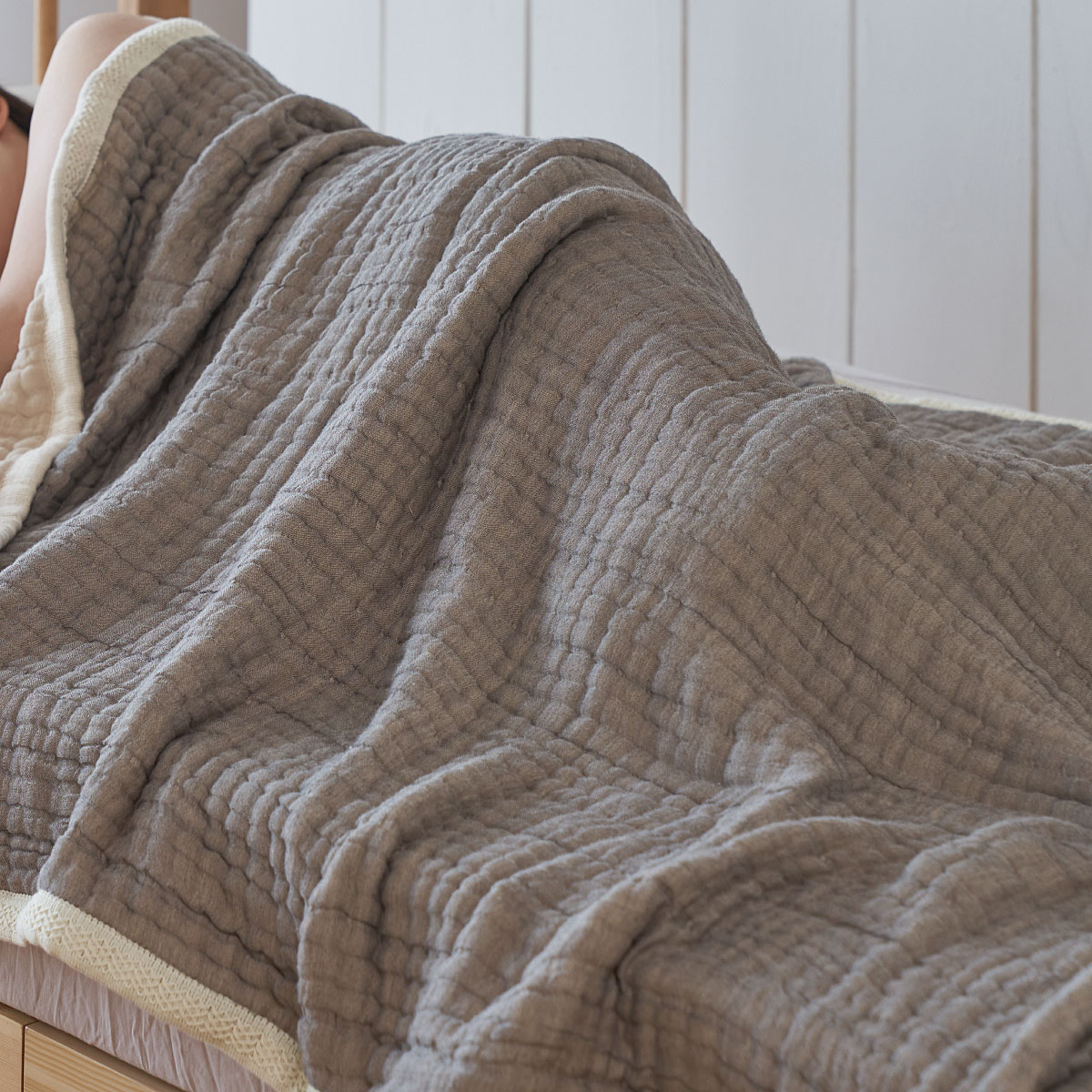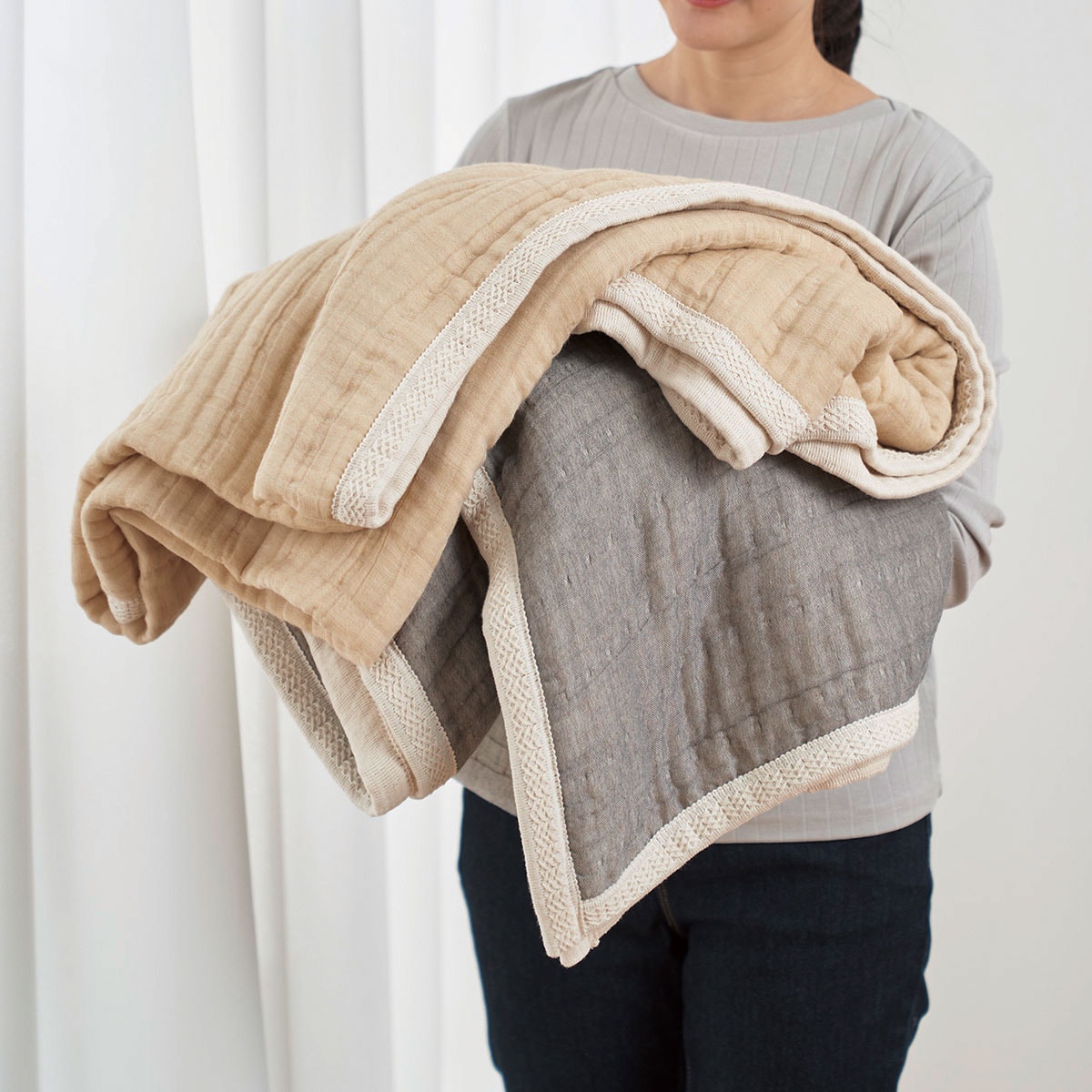 (上から)ベージュ、グレー8重ガーゼ素材が身体をやさしく包み込みます。