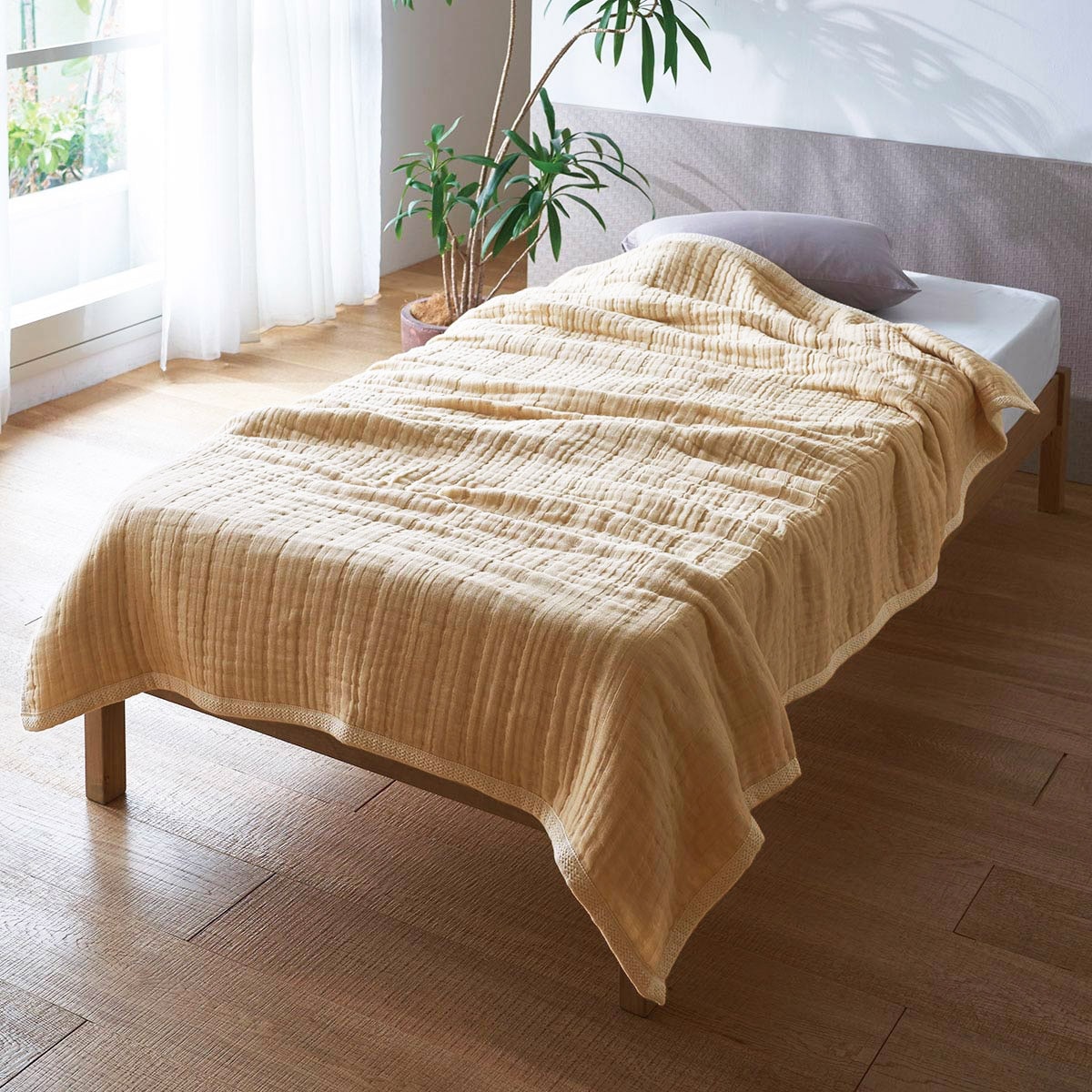 汗や湿気がこもりにくい8重構造のガーゼケットです。職人技で丁寧に仕上げているため一日数枚しか作れない希少品。ほどよく空気を含んで適度な保温性もあるため、季節の変わり目や夏の冷房対策として、タオルケット1枚だけだと肌寒いという方にもおすすめです。使い込むほどにやわらかく肌になじんでいく感覚をお楽しみください。