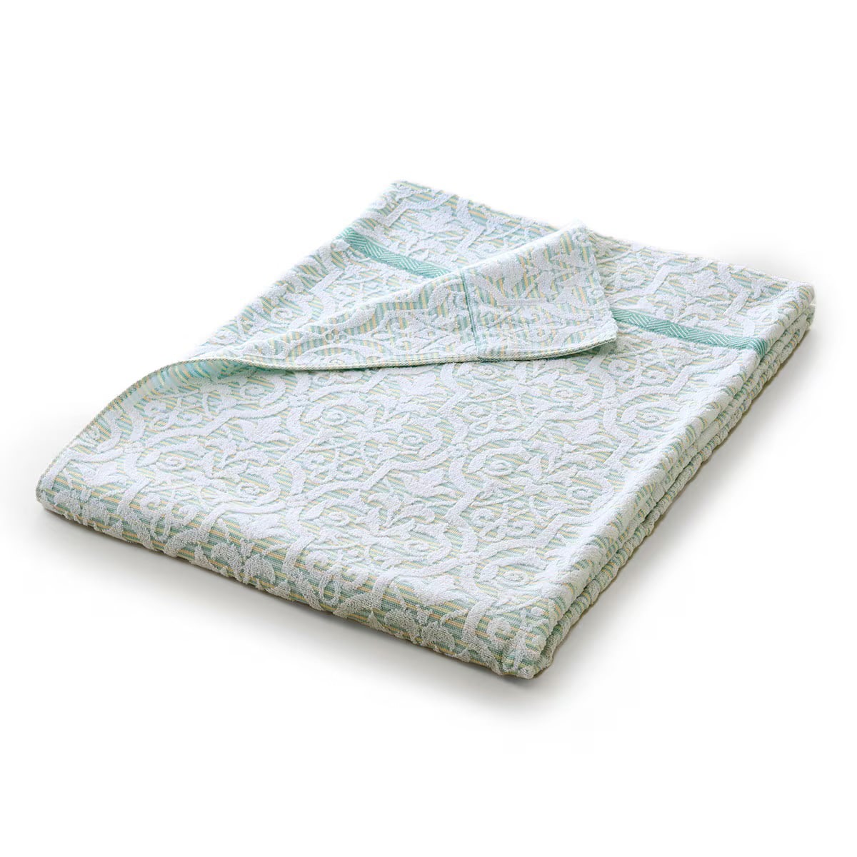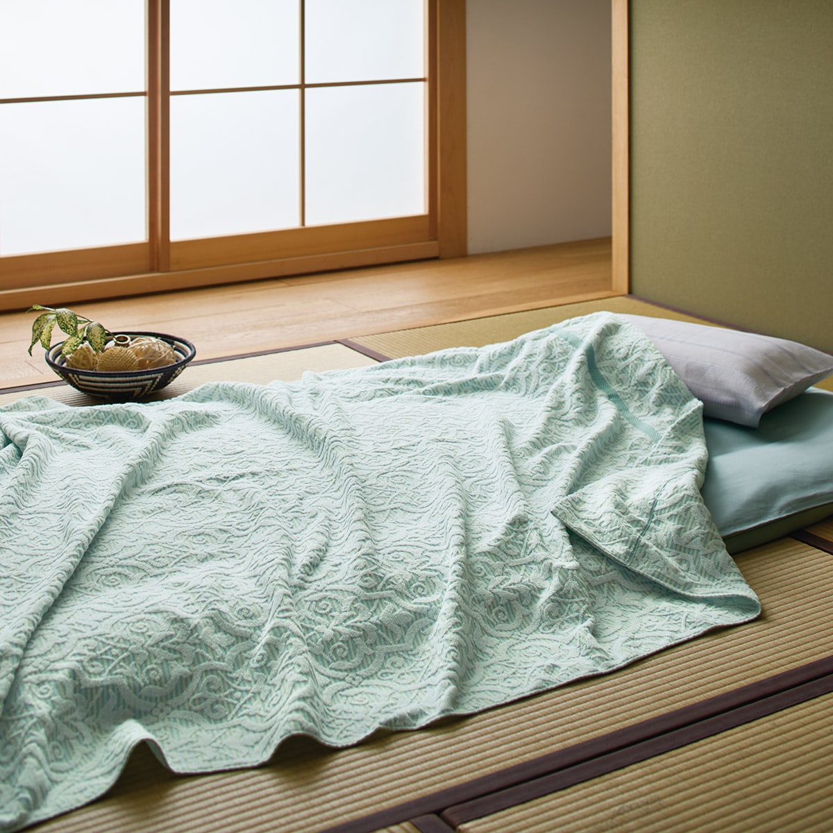 グリーン系やわらかでふわっと軽い掛け心地の先染めジャカードタオルケットです。