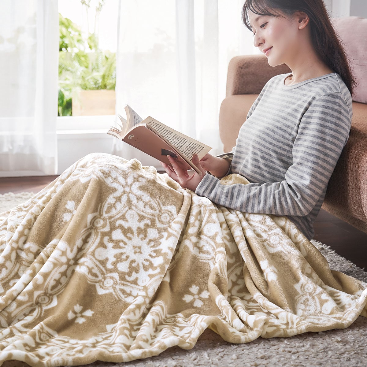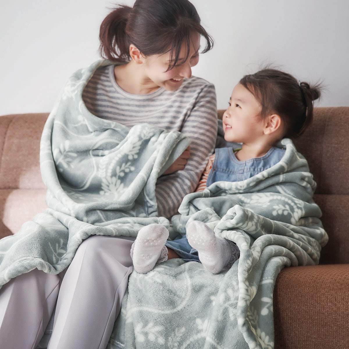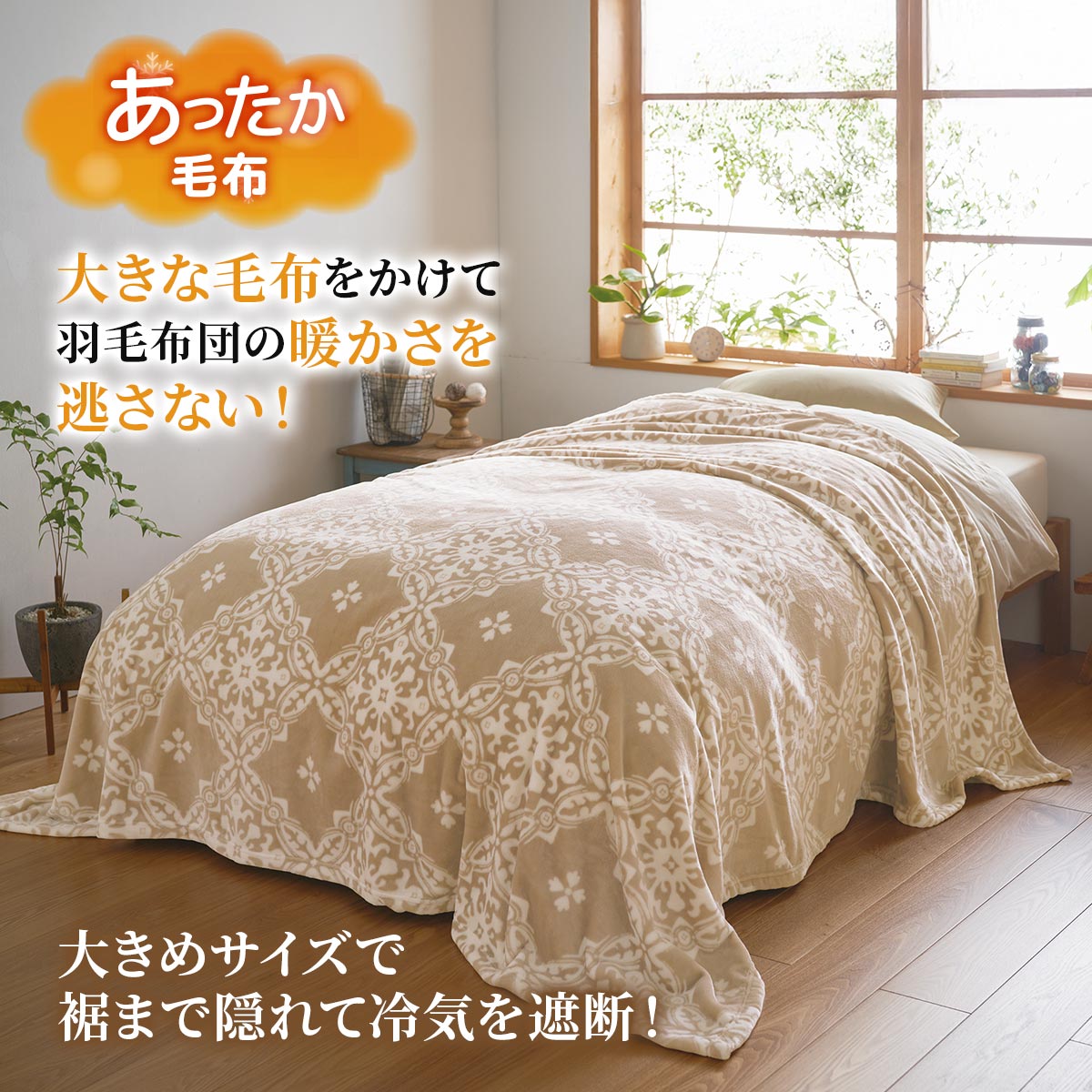 羽毛布団の上から毛布を掛けると、羽毛布団の吸湿発熱性を妨げることなく保温性を高められることをご存知ですか? この羽毛布団の上に掛ける毛布は、大きめサイズで布団の裾から入る冷気を遮断。さらに軽さにもこだわっているので、羽毛布団をつぶすことなく保温性を高めてくれます。もちろん羽毛布団以外の掛け布団にも効果を発揮します。マルチカバーとしても使えるので急な来客時にも便利♪ おしゃれな柄とクラシカルなカラーがお部屋を上品な空間に。