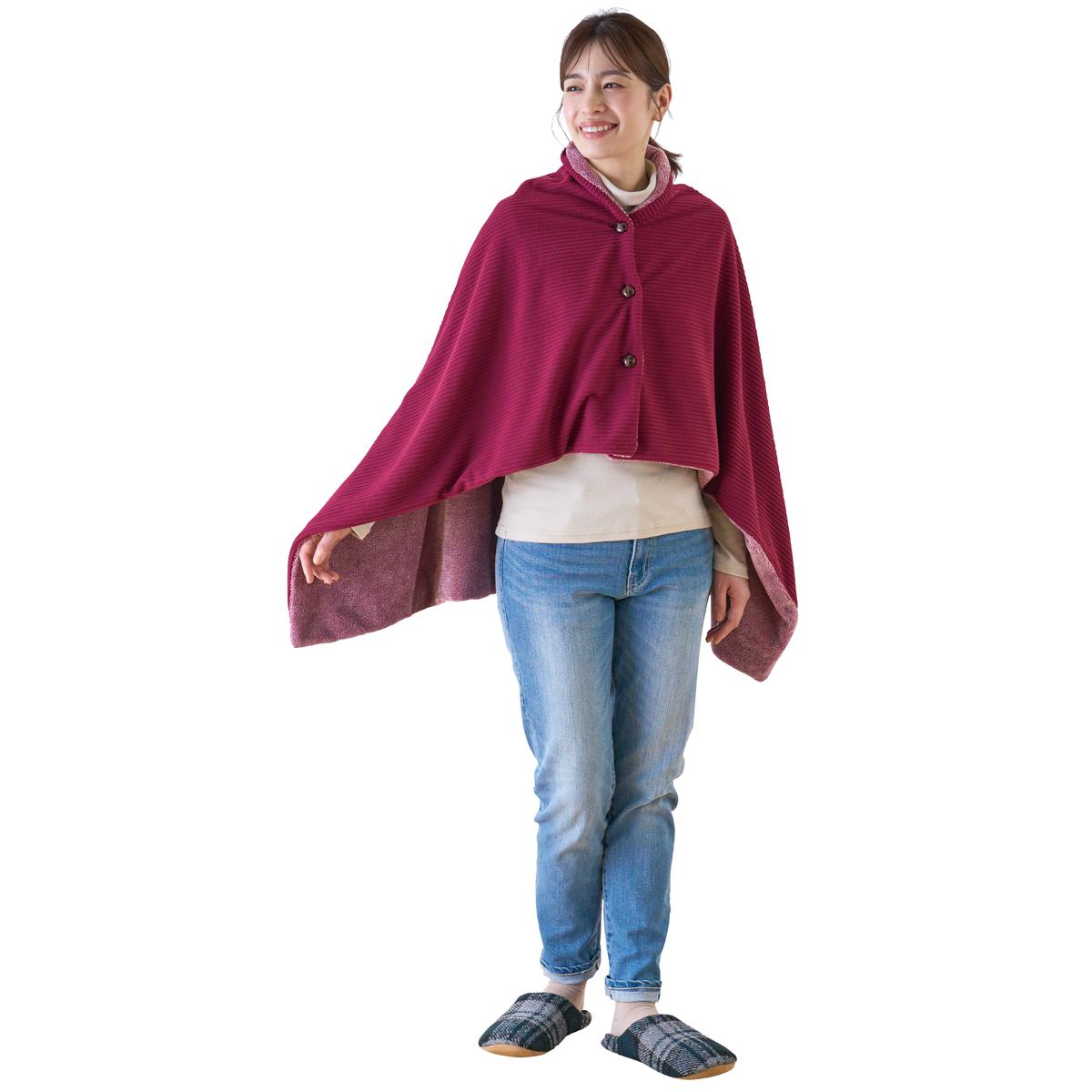 ワイン系羽織ってボタンをしめたらポンチョに。