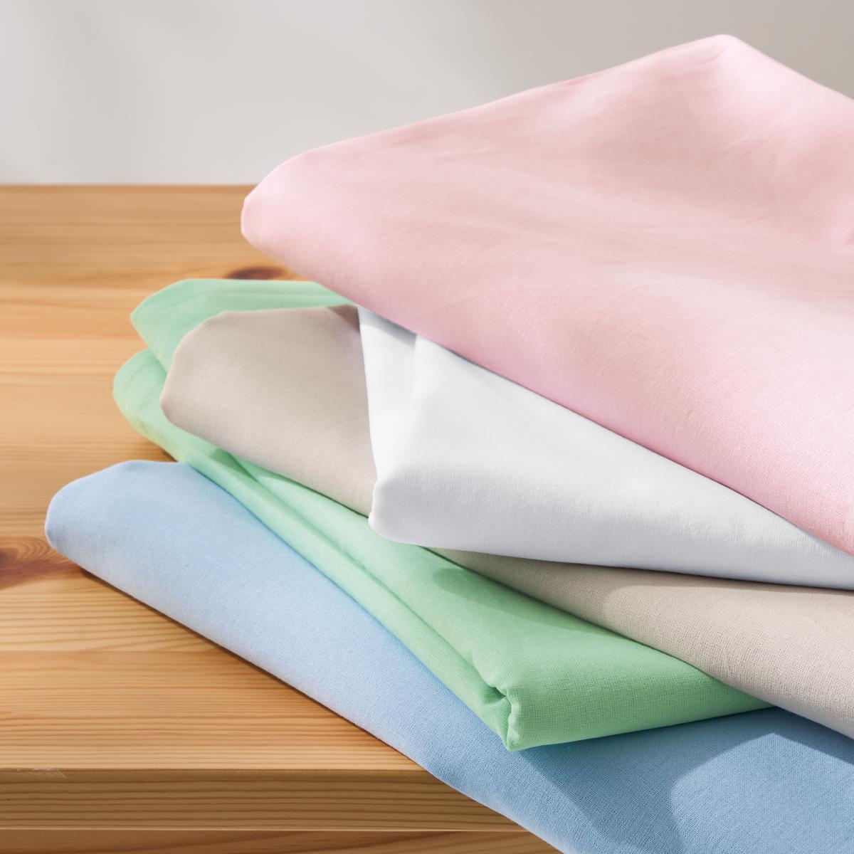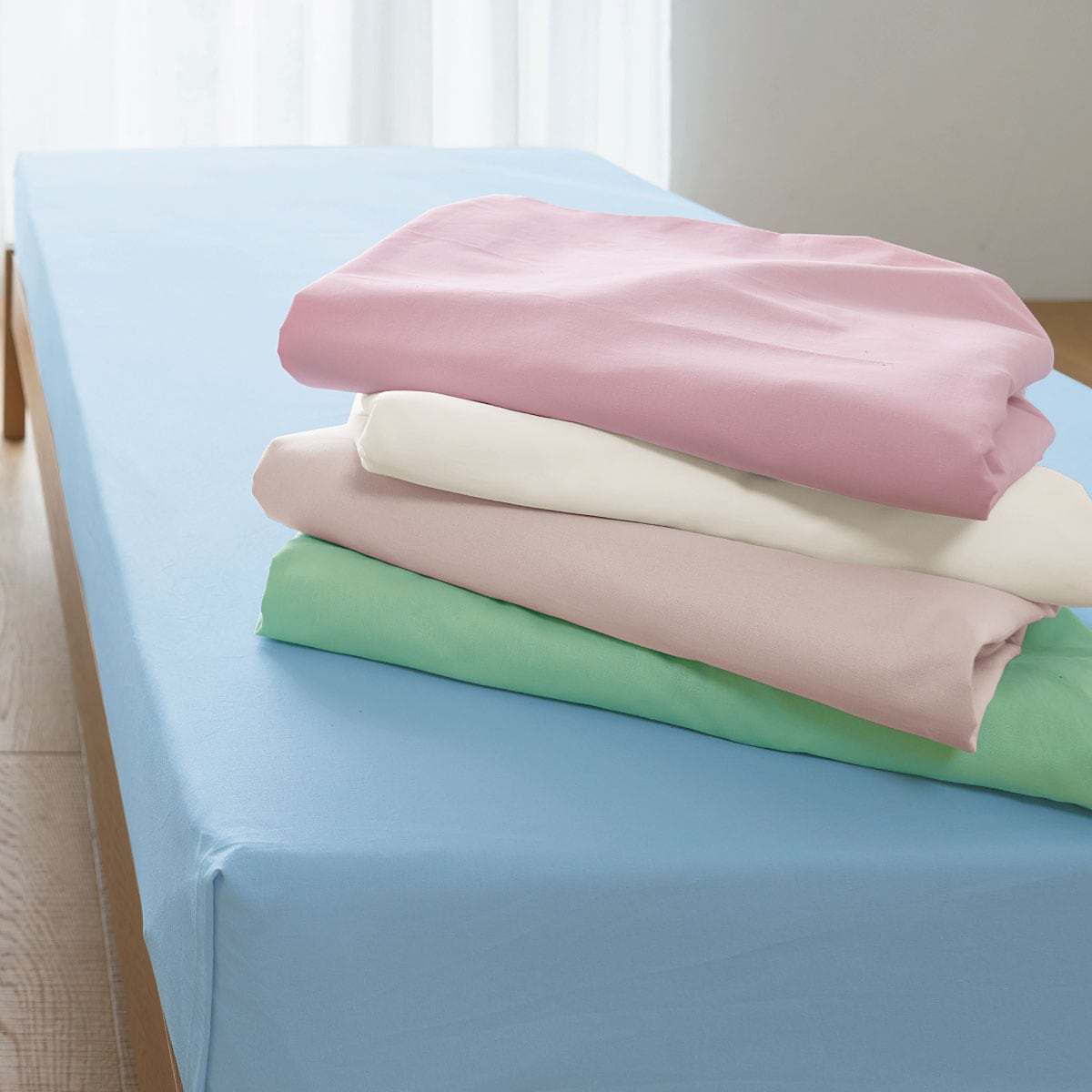 (上から)ピンク・ホワイト・ベージュ・グリーン・ブルー(ボックスシーツ)しっかり肉厚、丈夫で使いやすい平織りシーツです。