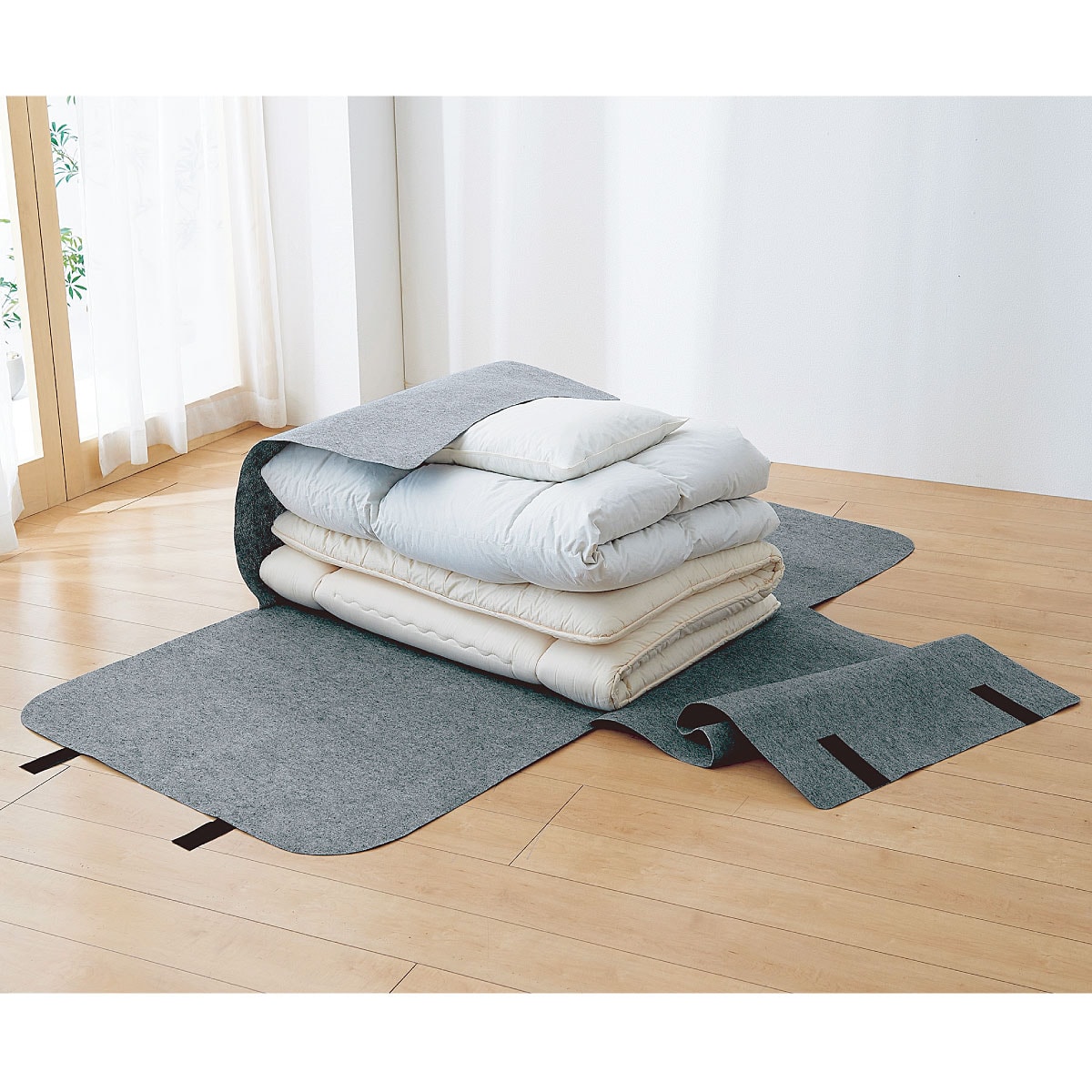 面テープ付きのベルトで寝具や衣類をやさしく圧縮・収納。