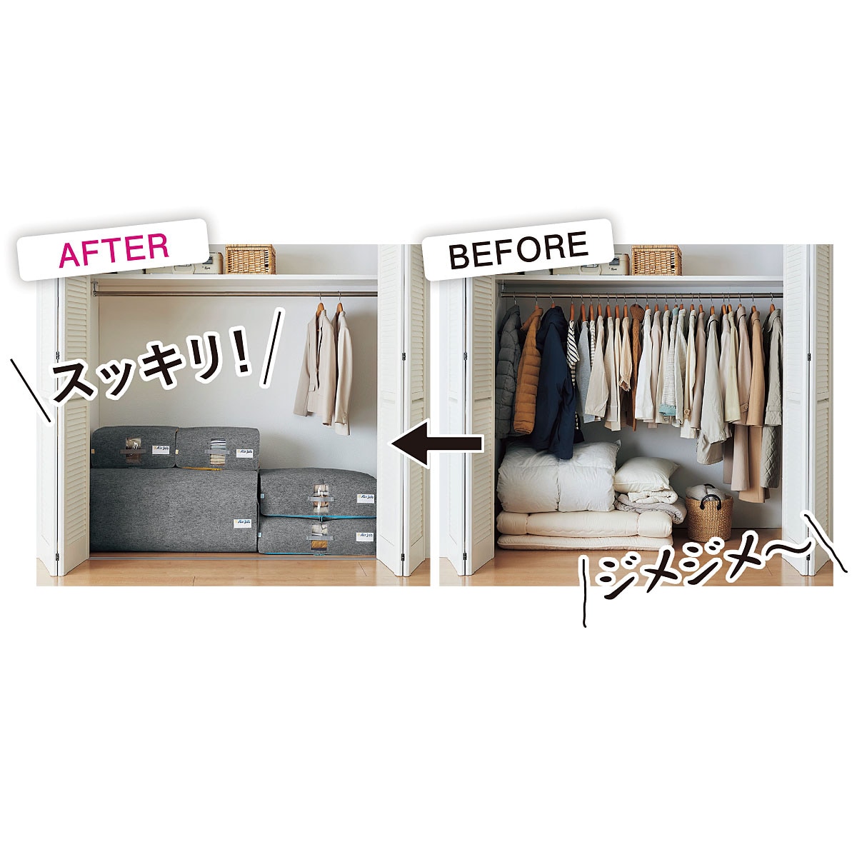 ジメジメしがちなクローゼットや押入れの中も湿気を取りながら収納できます。