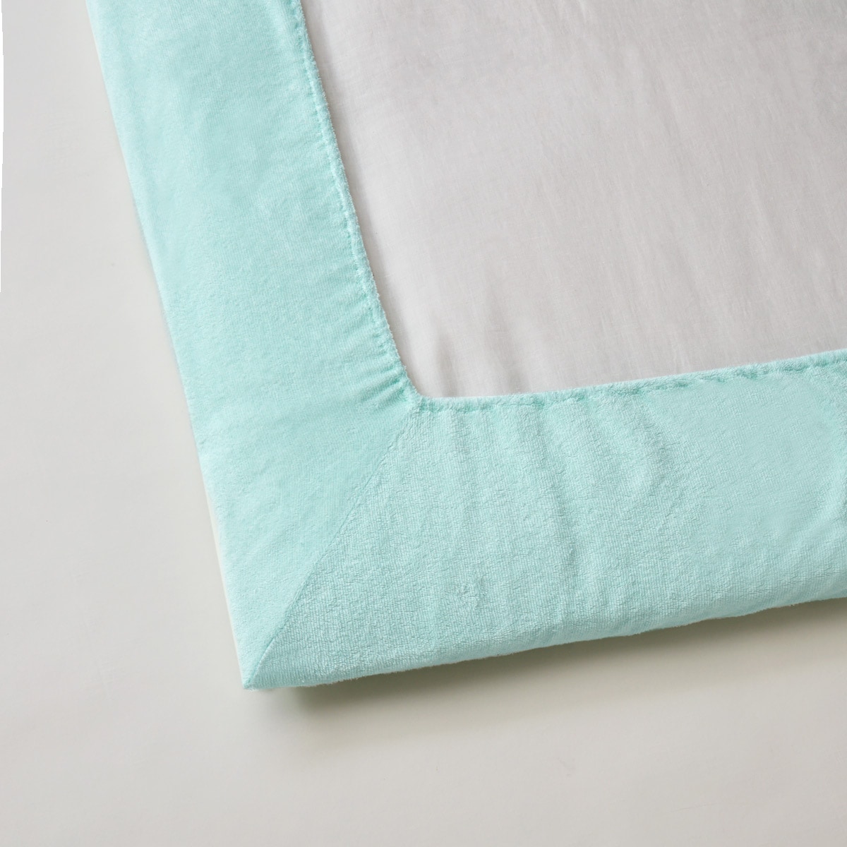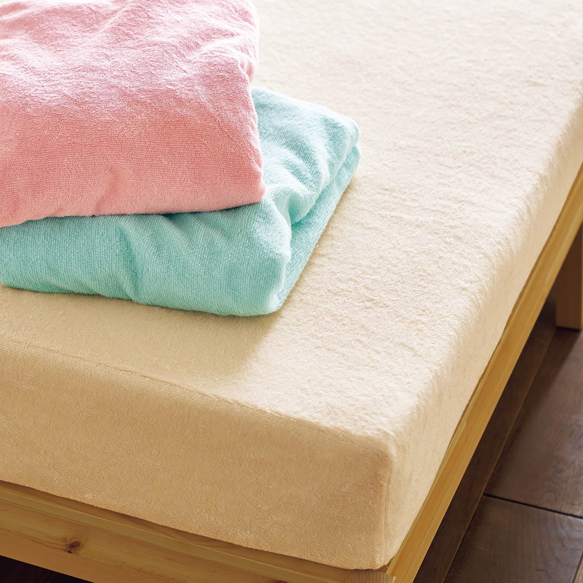(上から) ミスティピンク・ミスティブルー・アイボリベージュやわらかな肌ざわりのマイヤータオル生地で作ったシーツです。