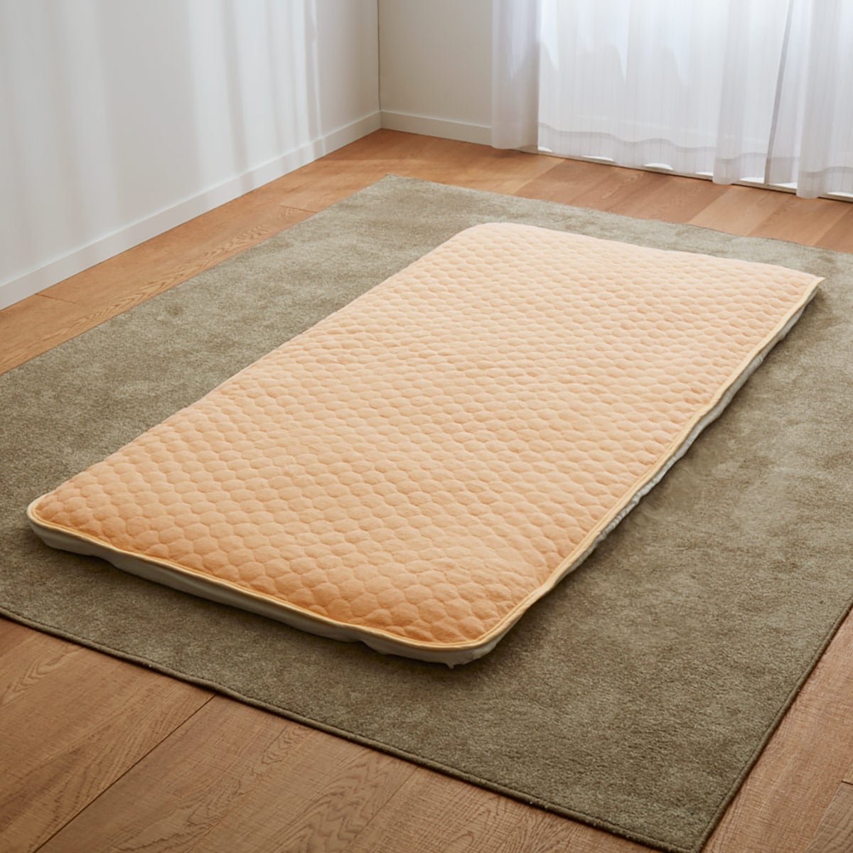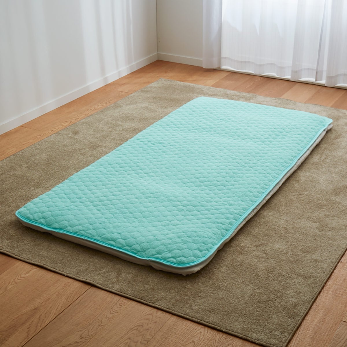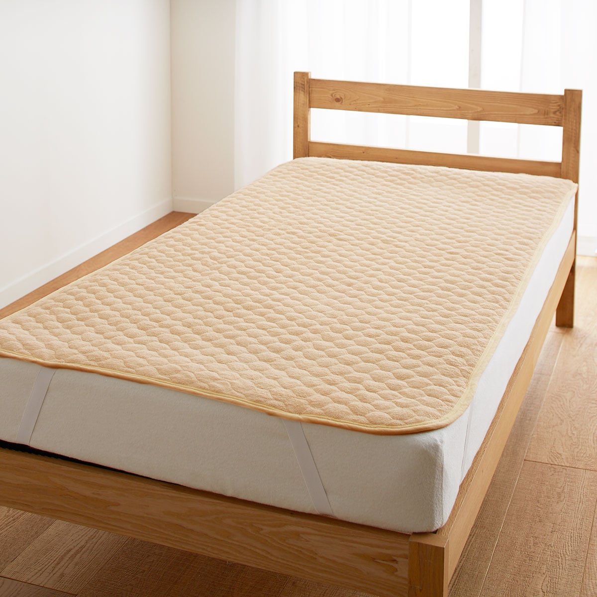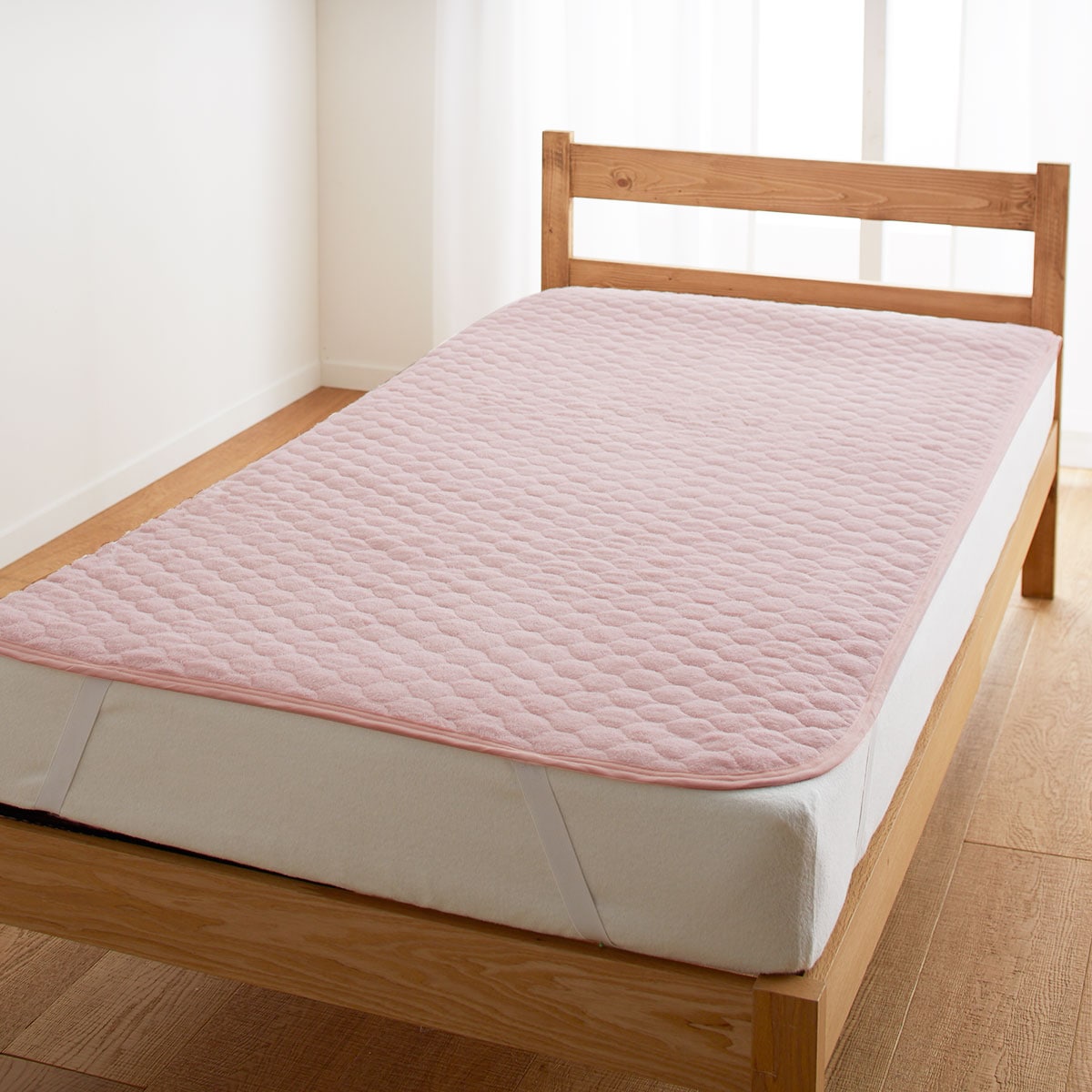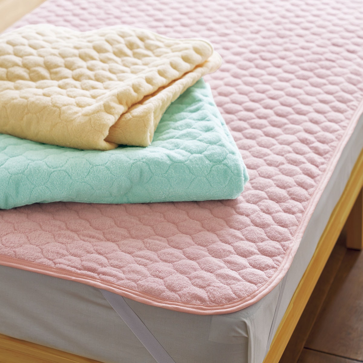 毛羽落ちしにくく気持ちよく眠れる! 綿100%パイルのマイヤータオル生地で作ったパッドシーツです。吸水性のある綿100%パイルが汗をよく吸い、中わた入りのキルトで寝心地もアップ。マットレスでも敷き布団でも使えます。
