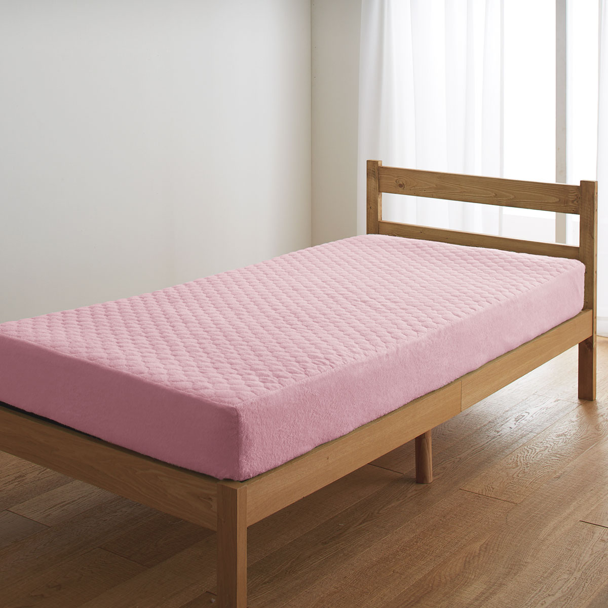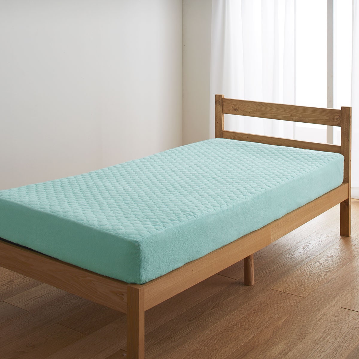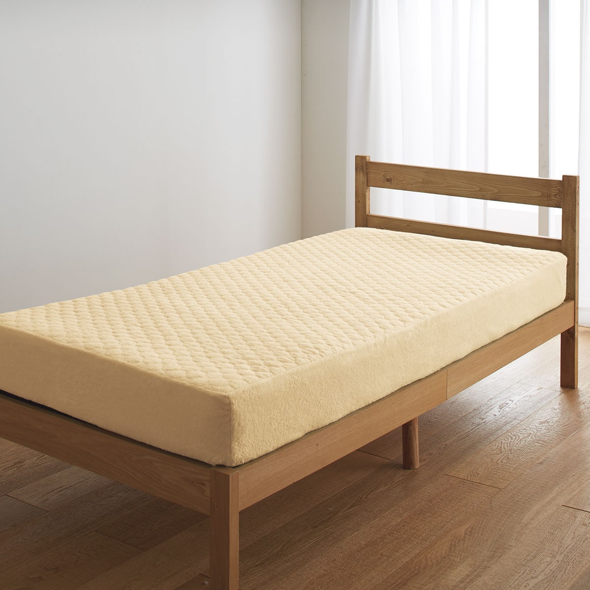 パッドシーツとボックスシーツが一体になったことで、付け替える手間が半分に。サイドまでぴったりフィットして見た目もキレイなパッド一体型ベッドシーツです。寝返りでパッドだけがズレてしまうという煩わしさからも解放されます。やわらかな肌ざわりのマイヤータオル生地は、吸水性の高い綿100%パイルが汗を吸い取ってくれるので、汗かきさんにもおすすめ。パイル抜けしにくいので、ご家庭の洗濯機で気軽に洗えます。裏側は全周ゴム仕様でズレにくく、着脱も簡単です。