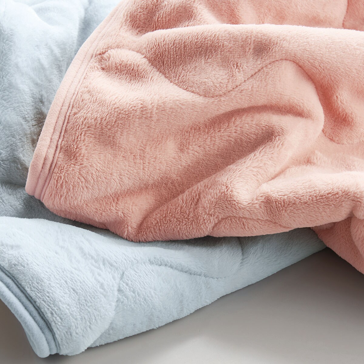 (上から) ピンク・ブルーみっしり繊維がつまって空気をためこむからあたたか。