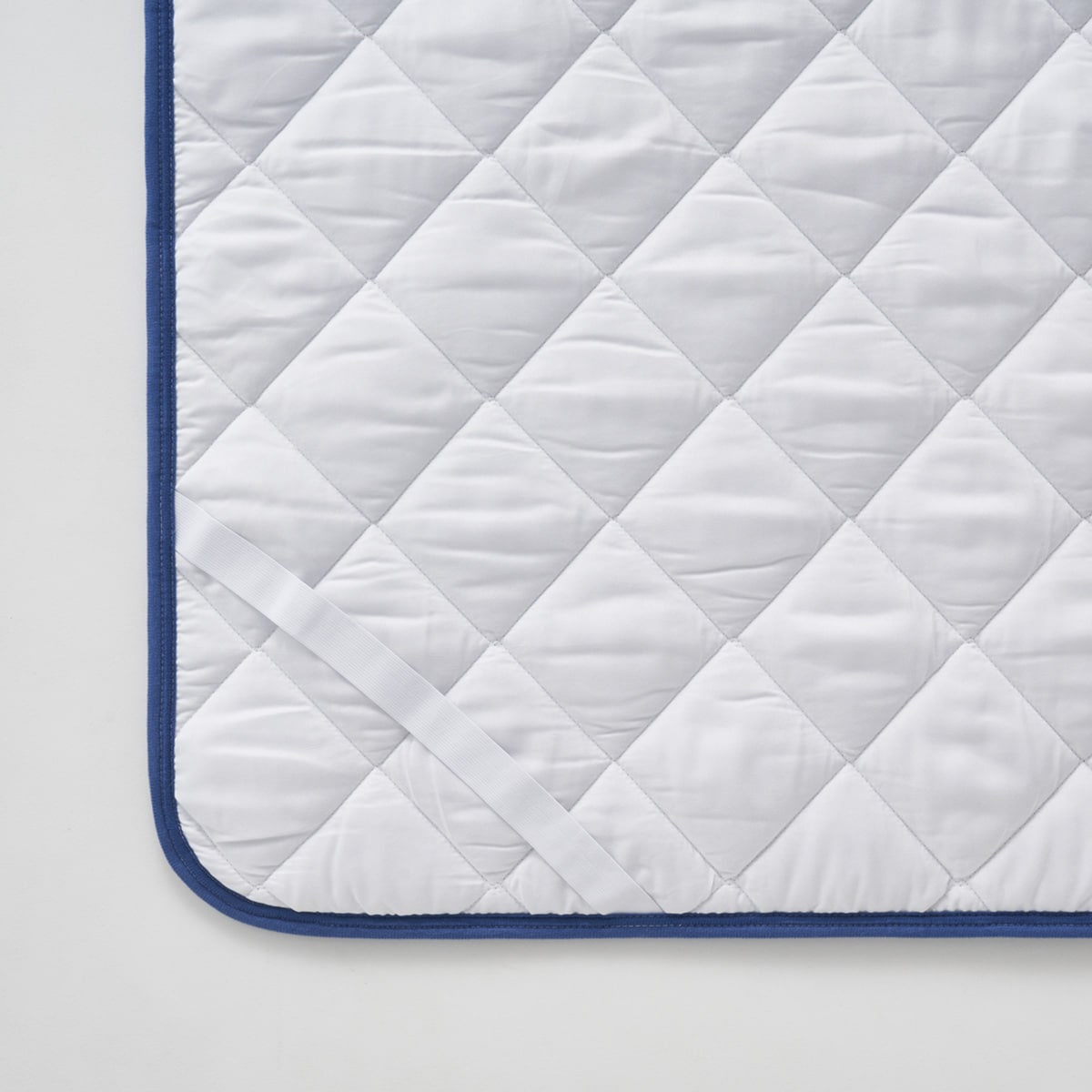 パウダーブルー肩まですっぽり! 寝返りしてもズレない、毛布一体型のパッドシーツです。