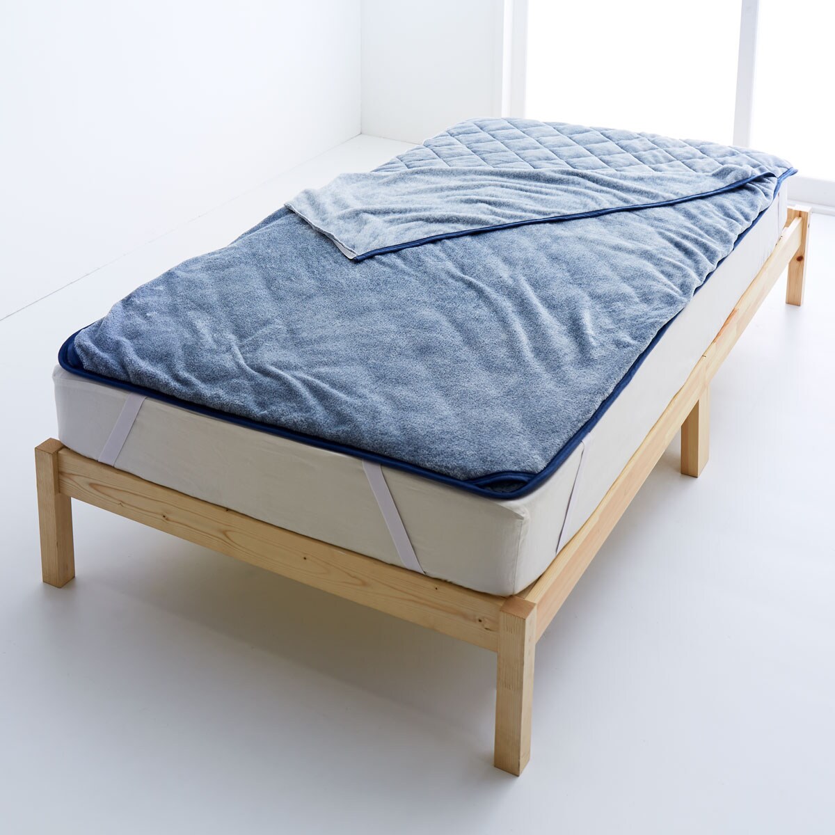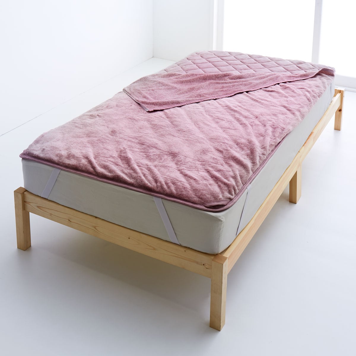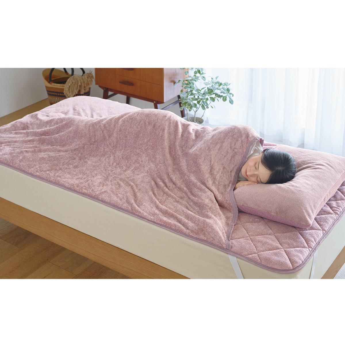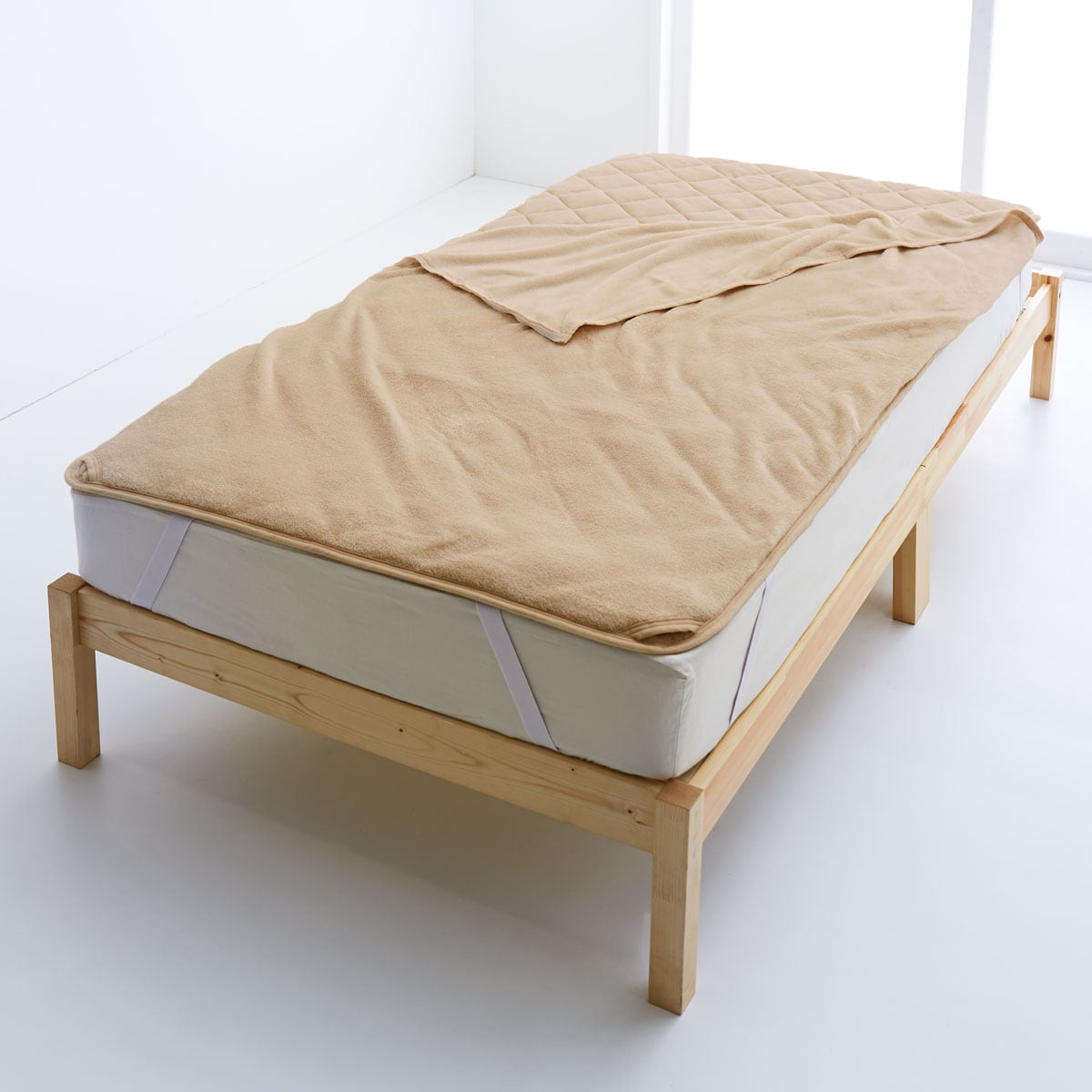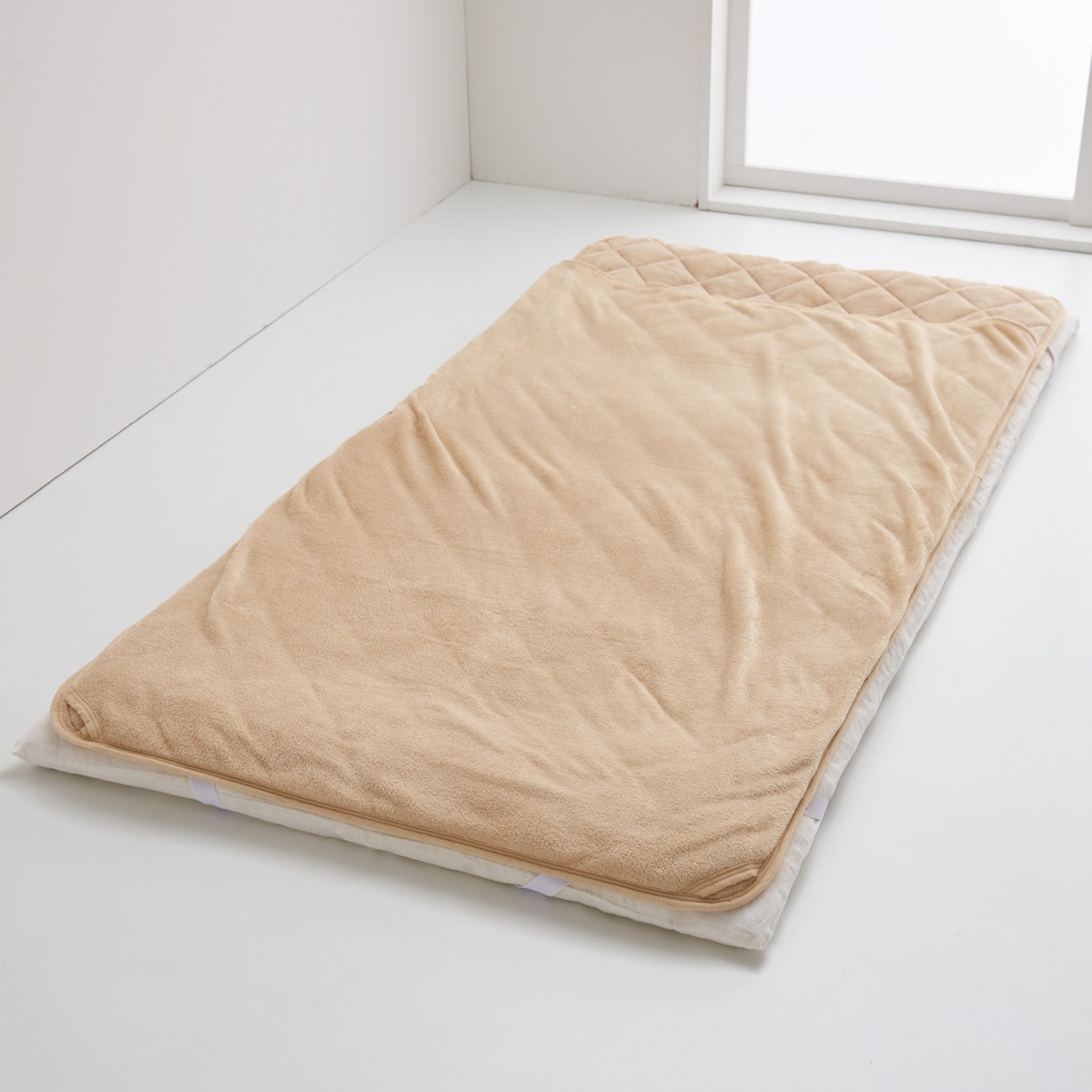 生地のグランド部分に、体から出る汗などの水分を吸収して熱へと変える吸湿発熱素材「スマートヒート®」を使用したパッドシーツです。直接肌に触れる面は毛布仕上げで、とろけるような暖かさに。パットシーツだけど全身包めちゃう。体を出しやすいファスナー付きスリット入り。両角には電気アンカーなどのコードが通せるコード穴付きと機能も充実。裏側は四隅の強化ゴム仕様でズレにくく、セットも簡単。汚れたらご家庭の洗濯機で気軽に洗えるので、清潔にお使いいただけます。