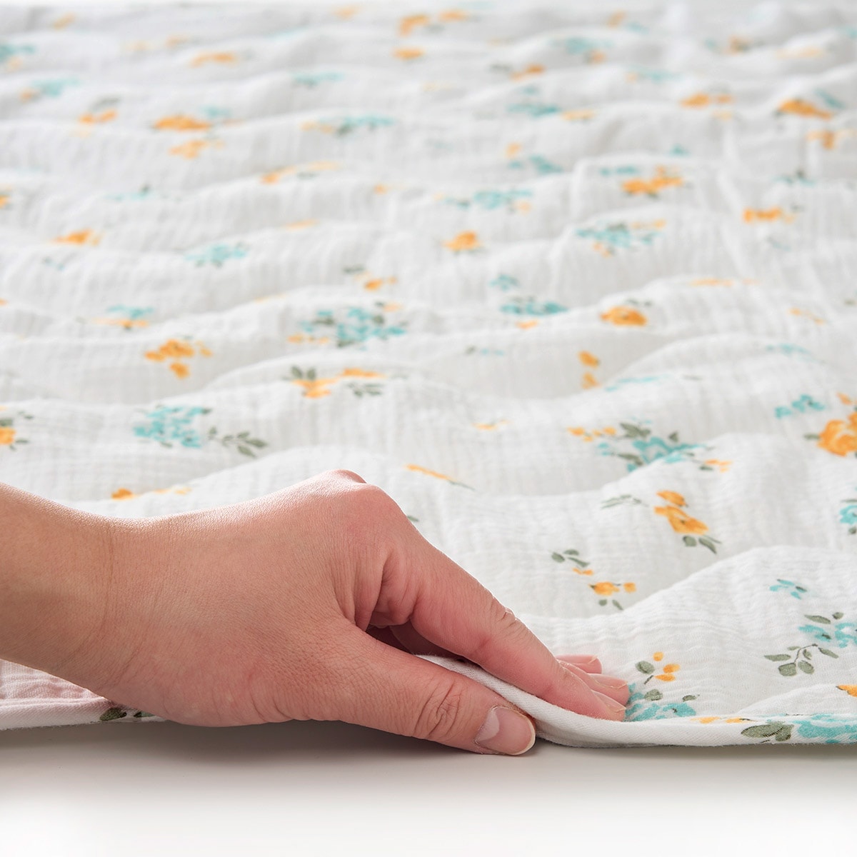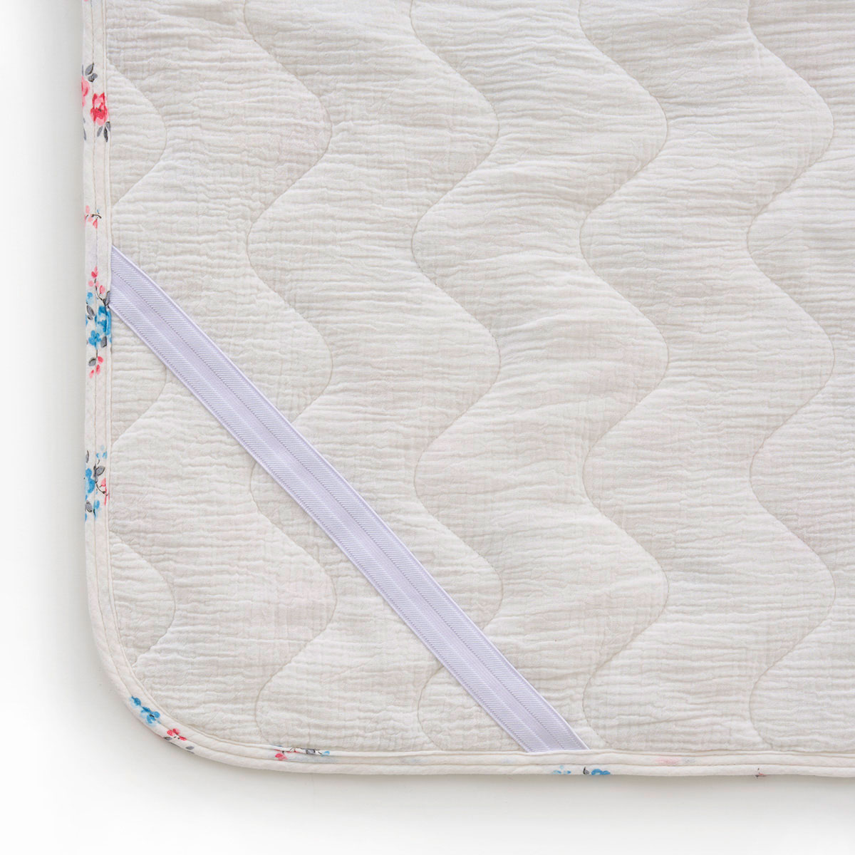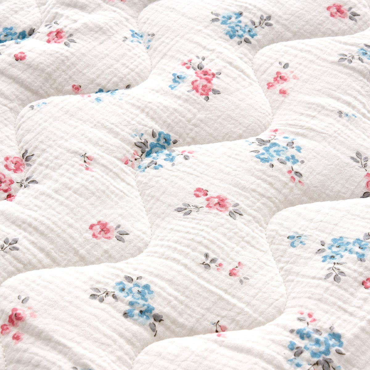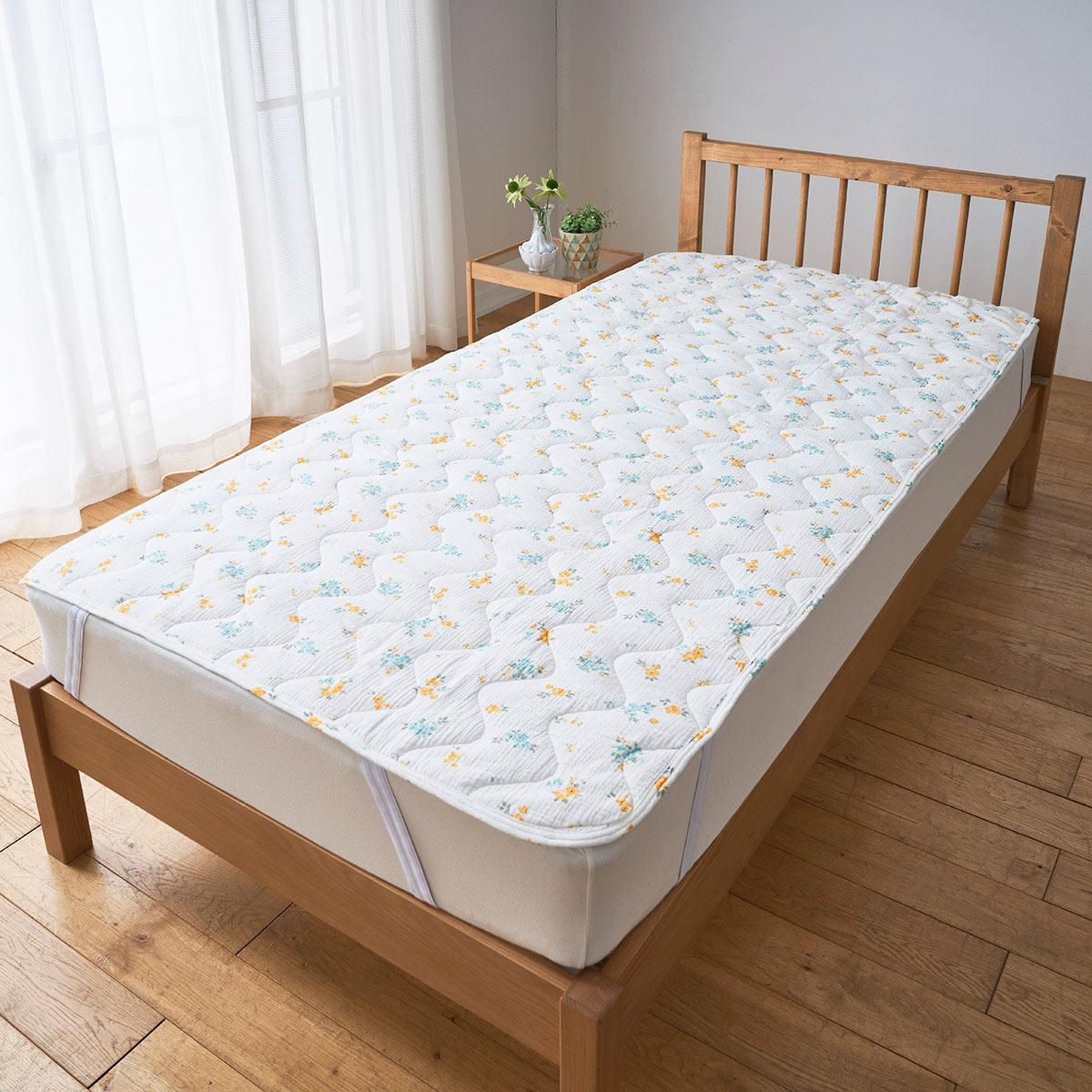 届いた日からふんわりやわらか! 小花柄がお部屋をやさしい印象にする、ダブルガーゼのパッドシーツです。使い始めから肌なじみをよくするために、2度製品に洗いをかけたこだわりの仕様。従来品より耐久性がパワーアップしました。汗をかいてもベタつかず、やさしくふわっとした肌あたりがお好みの方におすすめです。裏側は四隅強化ゴム仕様でズレにくく、セットも簡単。ご家庭の洗濯機で気軽に洗えるので、清潔にお使いいただけます。