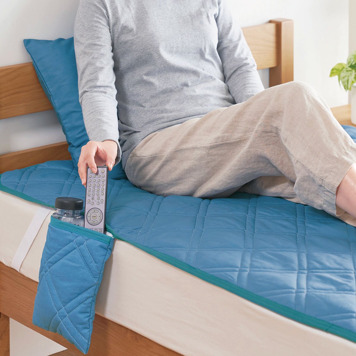 スマホやリモコンを寝ながらスッキリ収納! 新方式のポケット付きパッドシーツです。ちょっとした小物をサッと収納できるので、防災対策にもおすすめです。