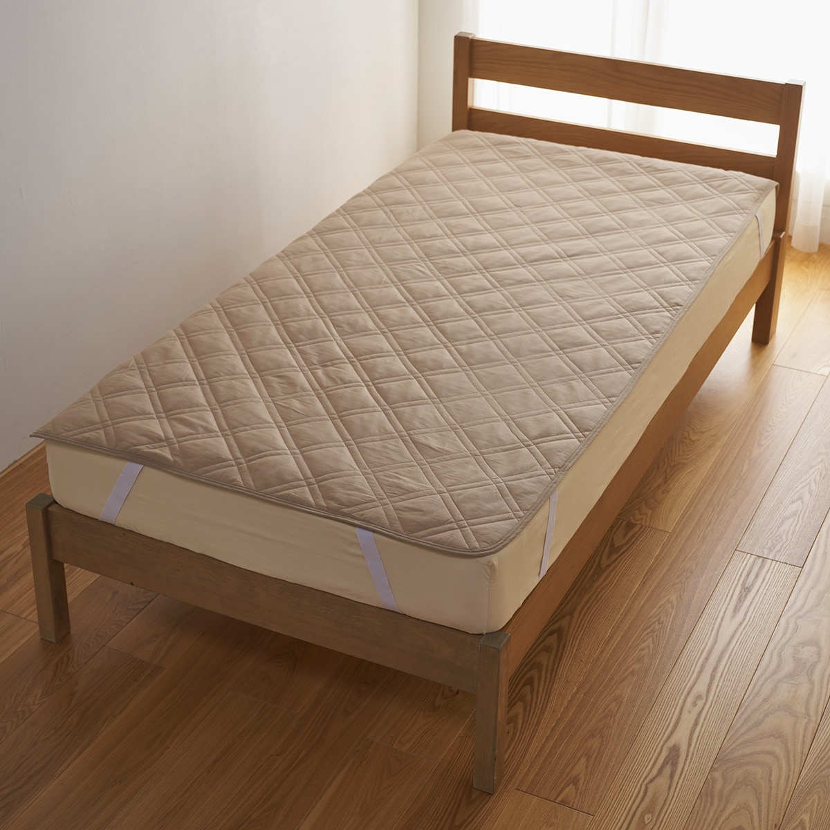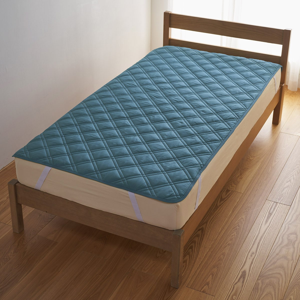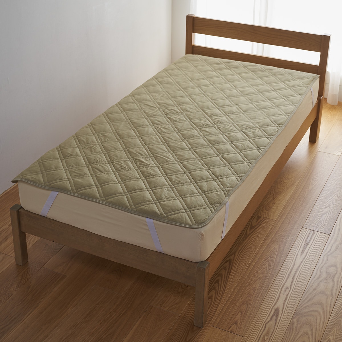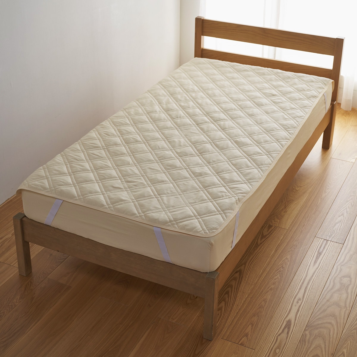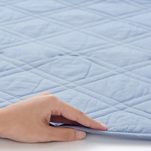 四隅の強化ゴムでズレにくく、着脱も簡単。敷き布団にも使用できます。