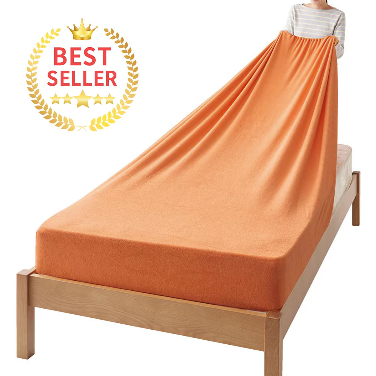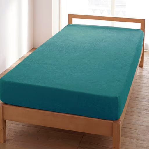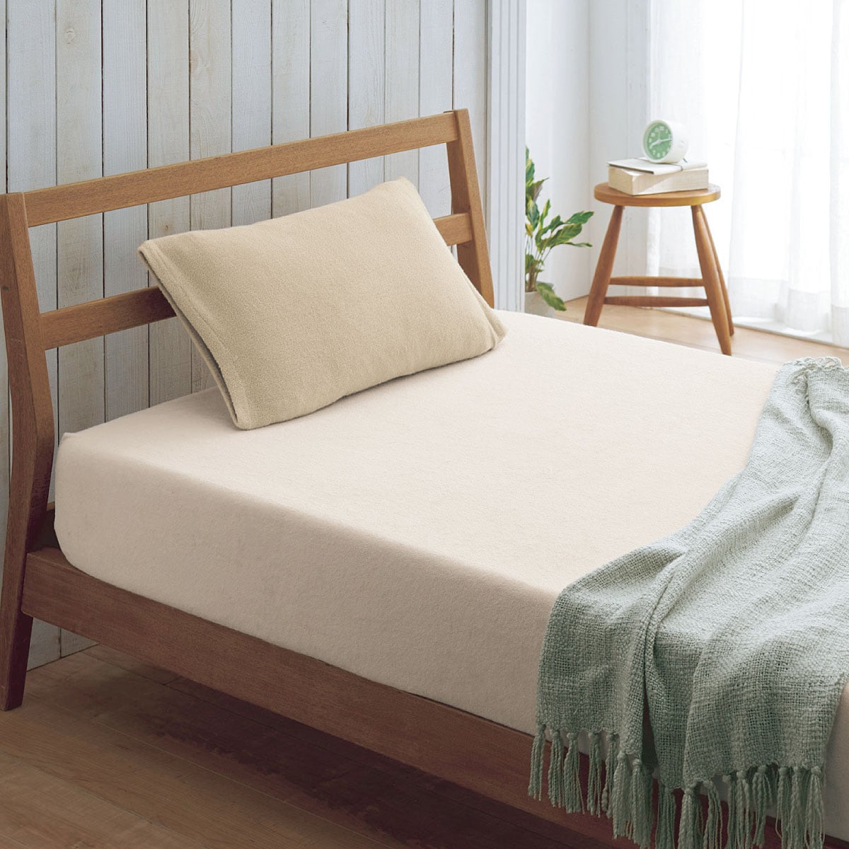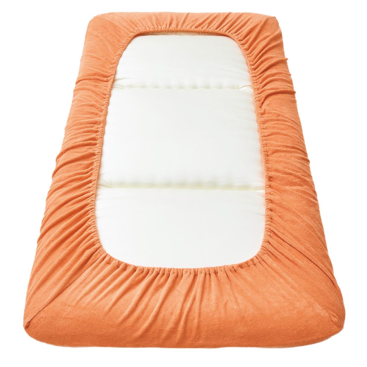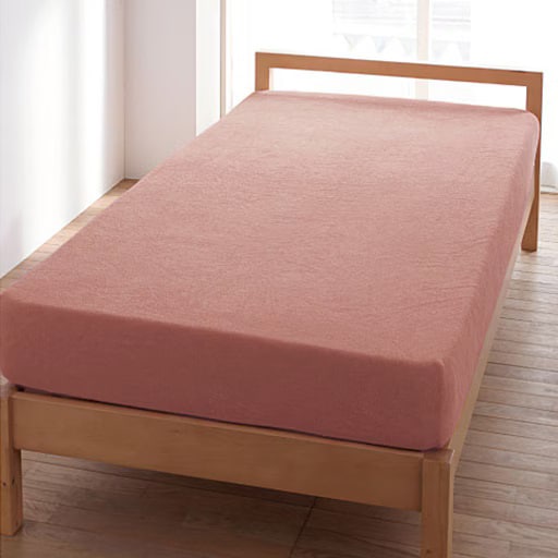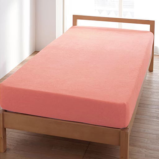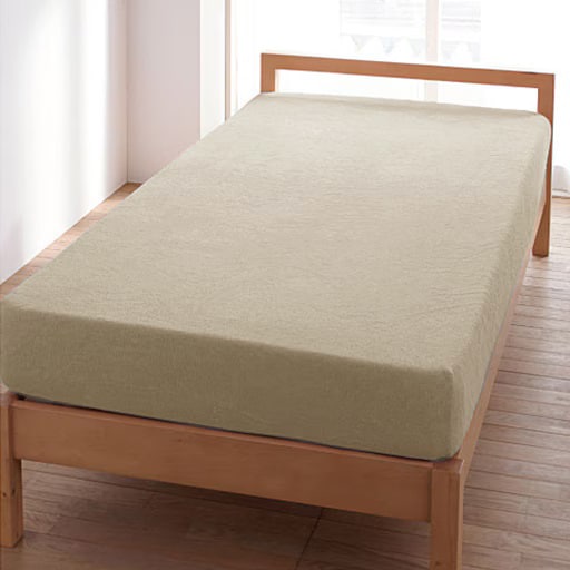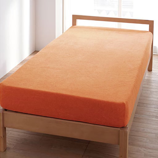アプリコット汗を吸って1年中気持ちいい、ふんわりタオル素材ののびのびシーツです。