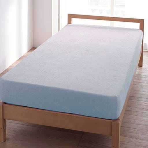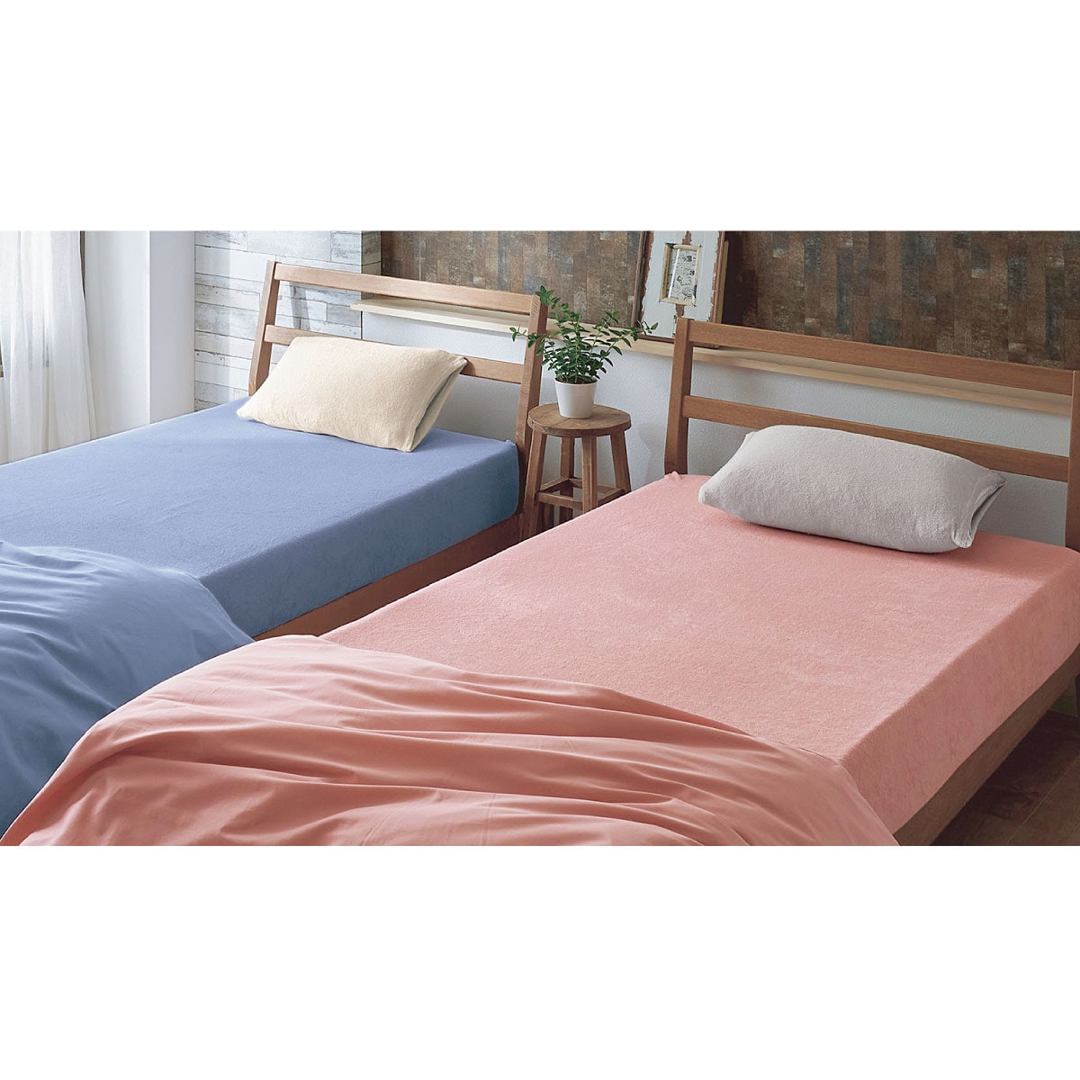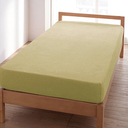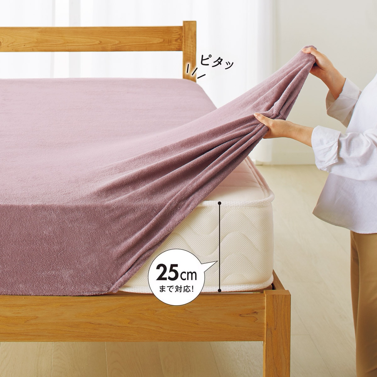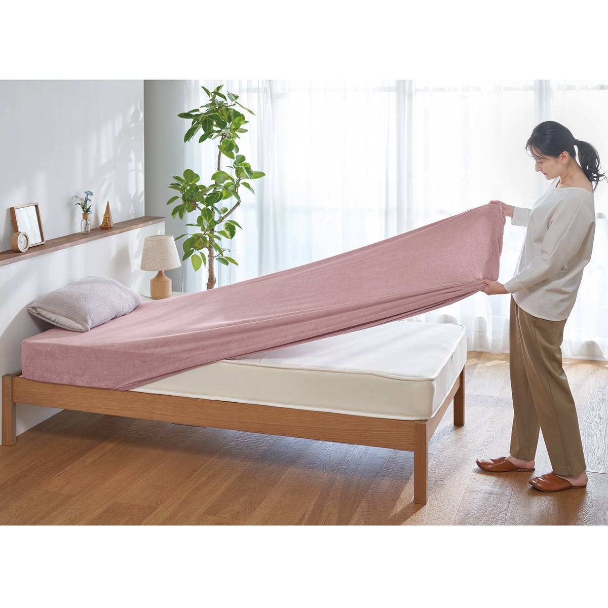 【のびるんフィット】「ピタッ」と決まる! 楽ちんベッドメイキング。汗を吸って1年中気持ちいい、ふんわりタオル素材ののびのびボックスシーツです。伸縮する生地だから、シワになりにくくきれいにぴったりフィット。お好みの色をお選びいただけます。